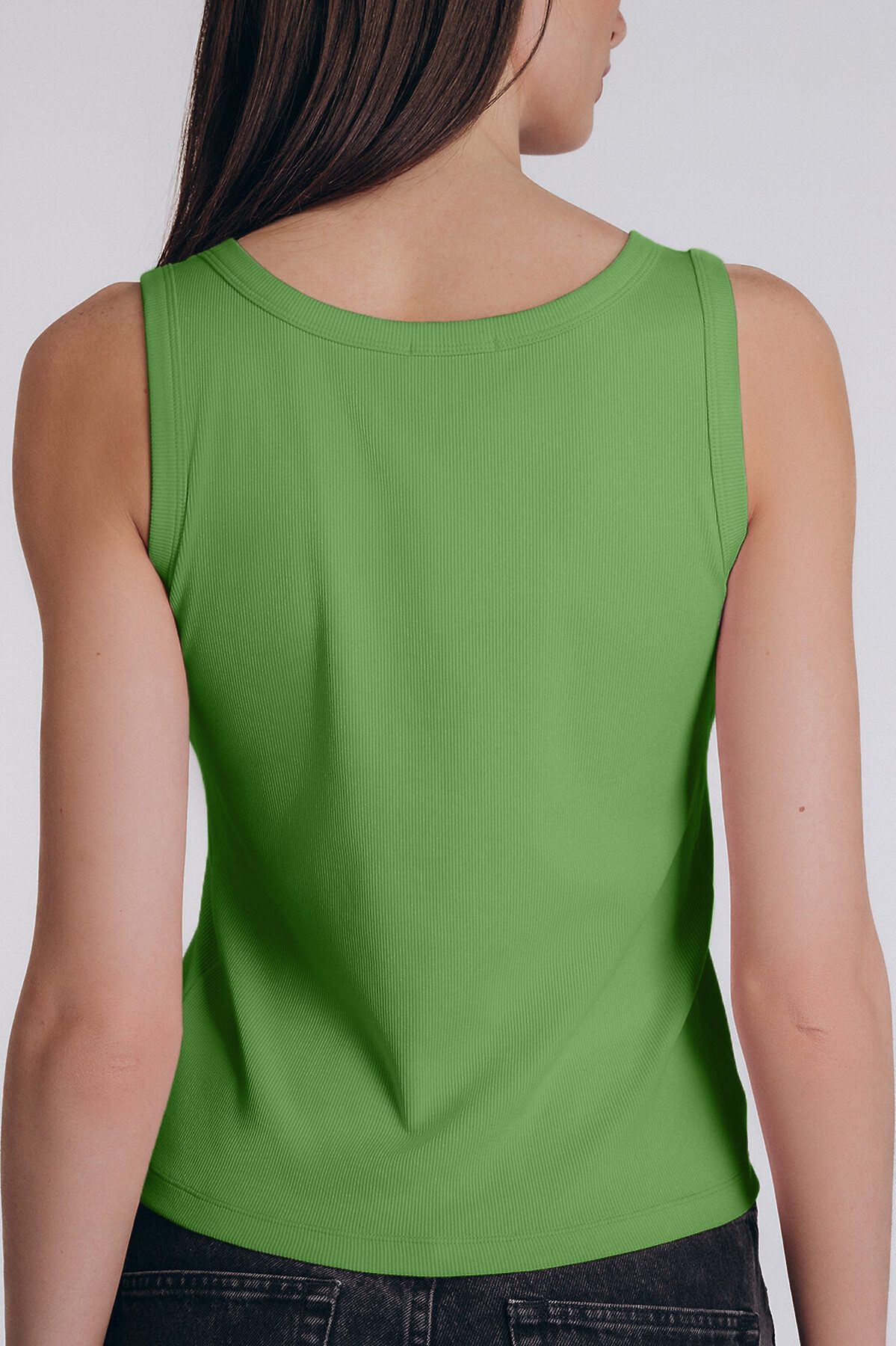 Практичная майка прямого кроя из хлопково-вискозной ткани с характерной рубчатой фактурой, насыщенного зеленого цвета.