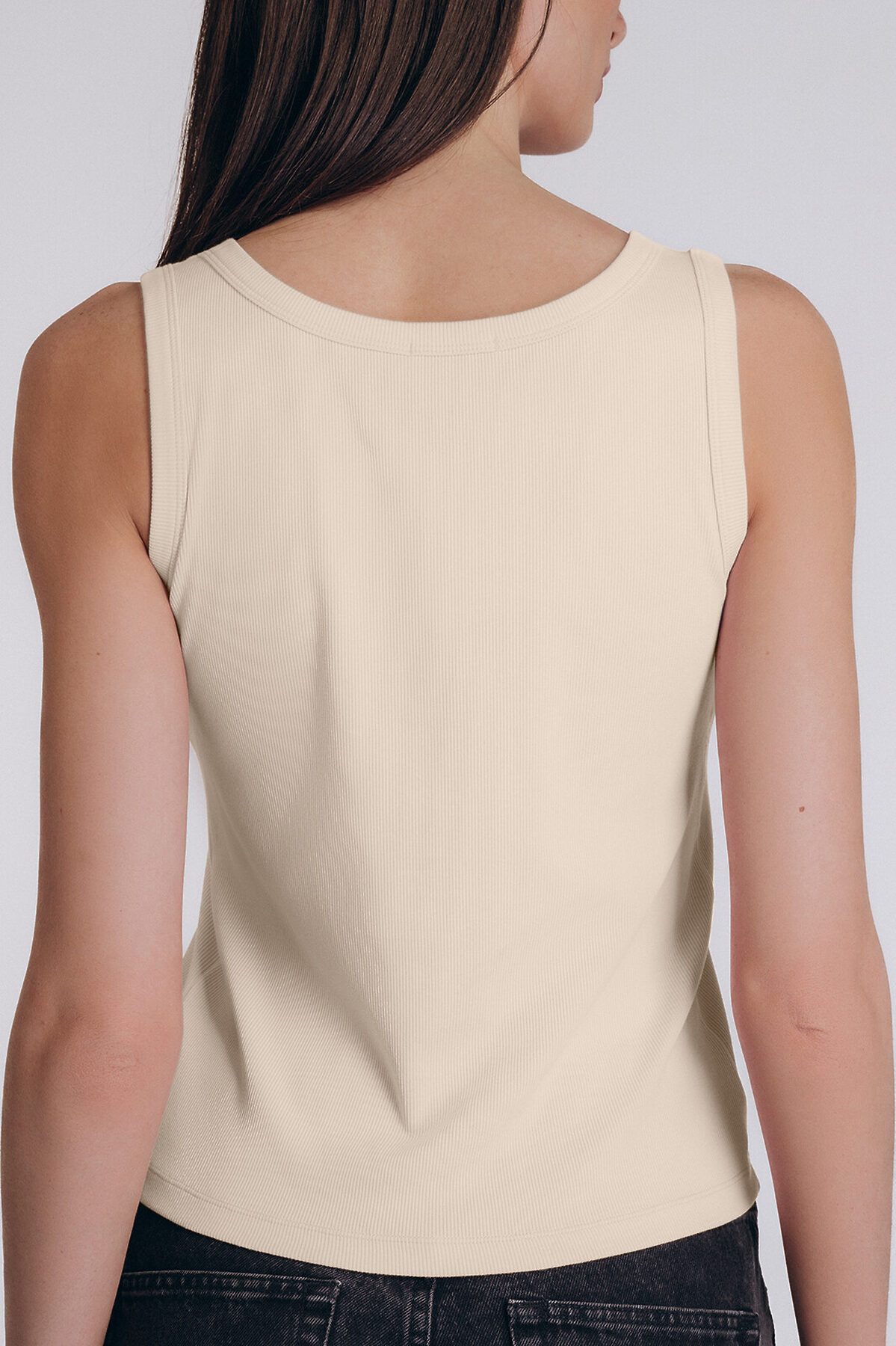 Бежевая майка классического кроя из хлопково-вискозного полотна с тонкой рубчатой текстурой. Идеальная основа для капсульного гардероба. Универсальная модель для создания как строгих деловых, так и легких повседневных нарядов.