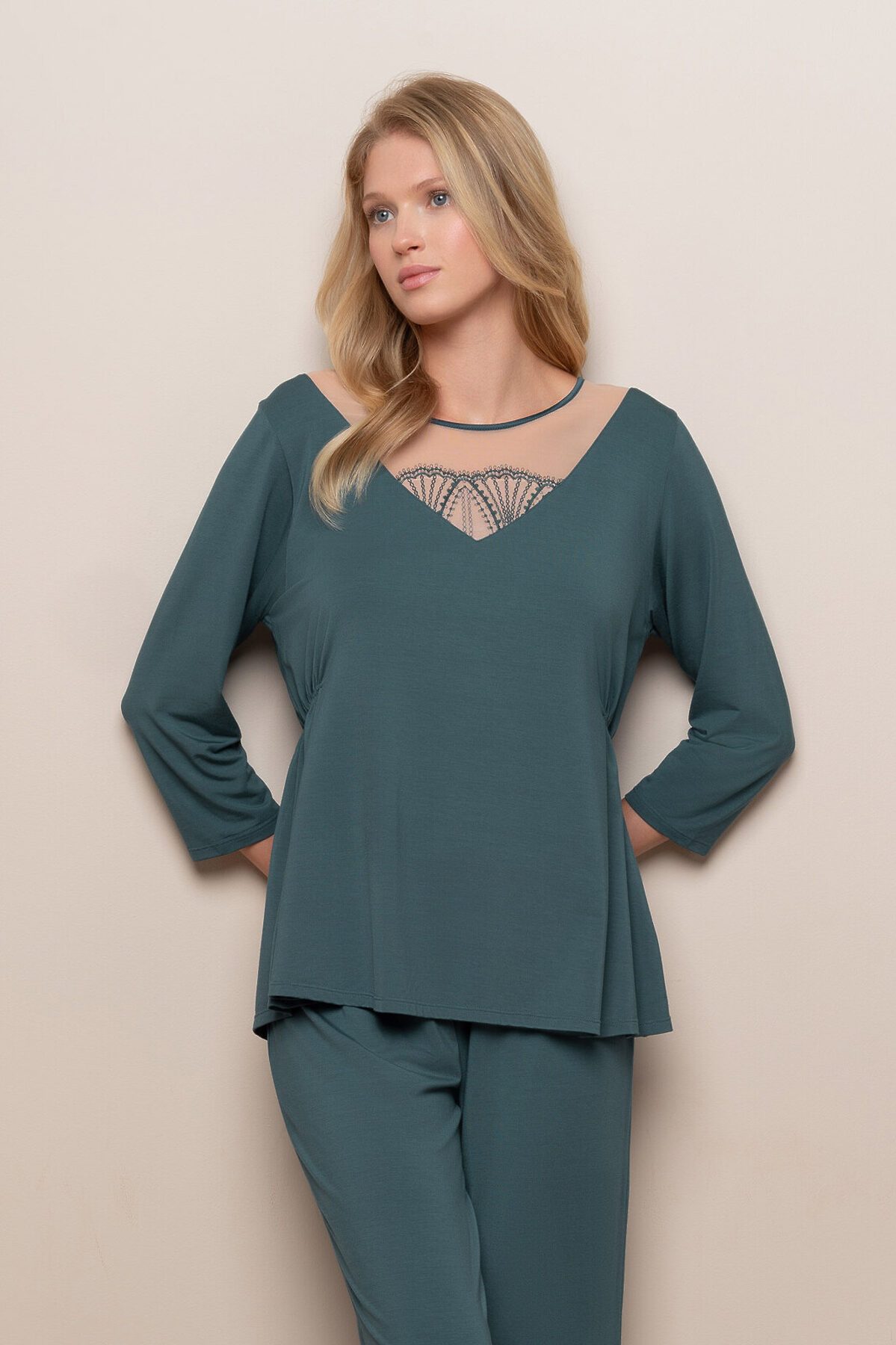 Женская пижама из модала включает футболку с брюками. Футболка с длинными рукавами свободного кроя не сковывает движений. Она украшена кружевом в зоне декольте. Брюки на широкой эластичной резинке надежно фиксируются на талии и не сползают во время носки.