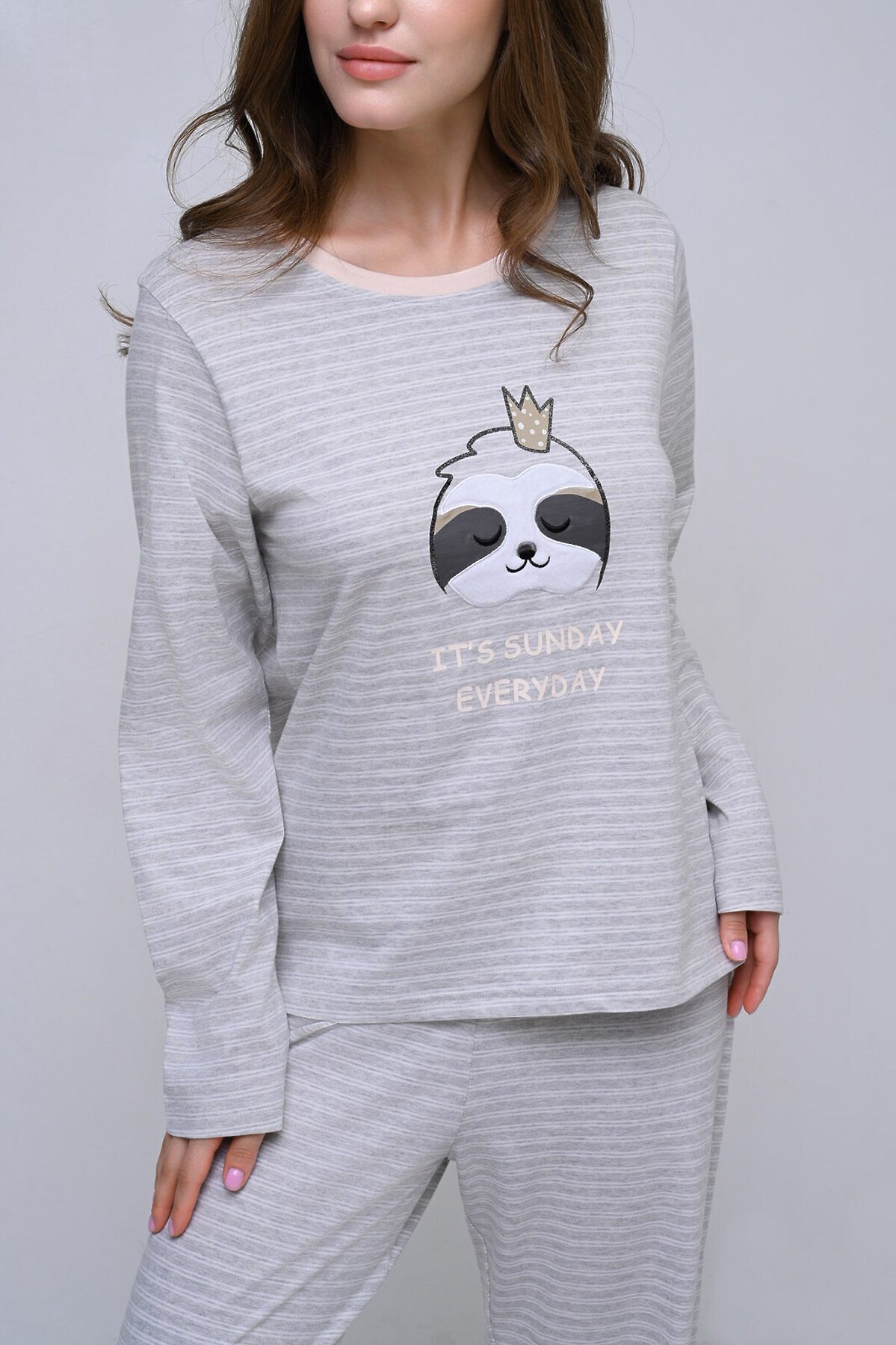 Женская пижама в полоску из хлопкового материала включает кофту и брюки. Кофта с длинными рукавами и круглым вырезом, украшенная анималистичным принтом. Брюки на мягкой эластичной резинке с регулирующим шнурком надежно держатся на талии, обеспечивая удобство в движении и оптимальную посадку.