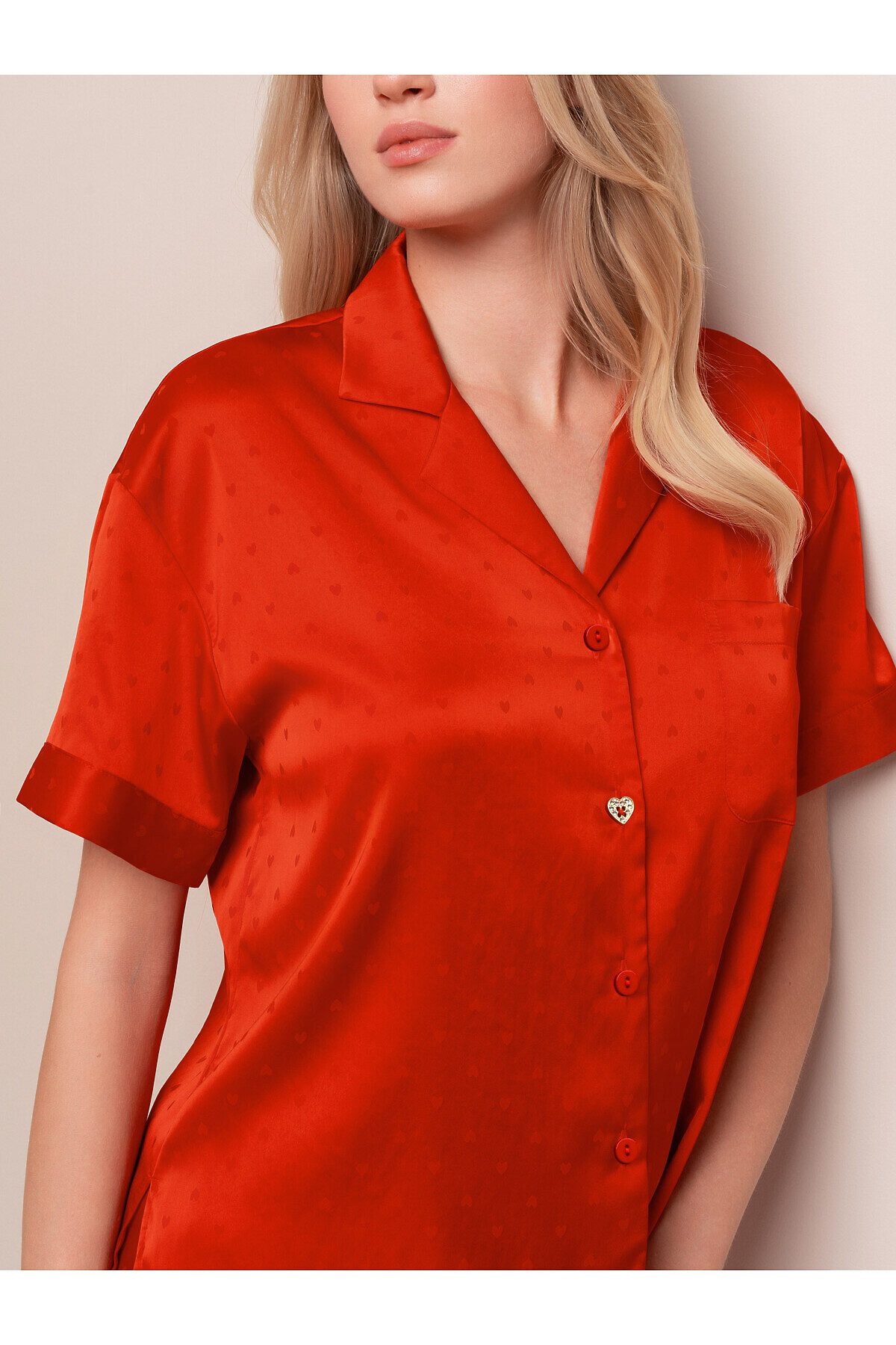 Женская пижама из легкого и дышащего полиэстера пропускает воздух, что помогает ей оставаться комфортной и свежей во время сна. Верхняя часть в виде футболки с отложным воротником и пуговицами в тон ткани придает образу стильную завершенность. Одна пуговица в форме сердечка украшена драгоценными камнями. Шорты на мягкой резинке удобно облегают талию, создавая непринужденный и уютный комплект для сна и отдыха.