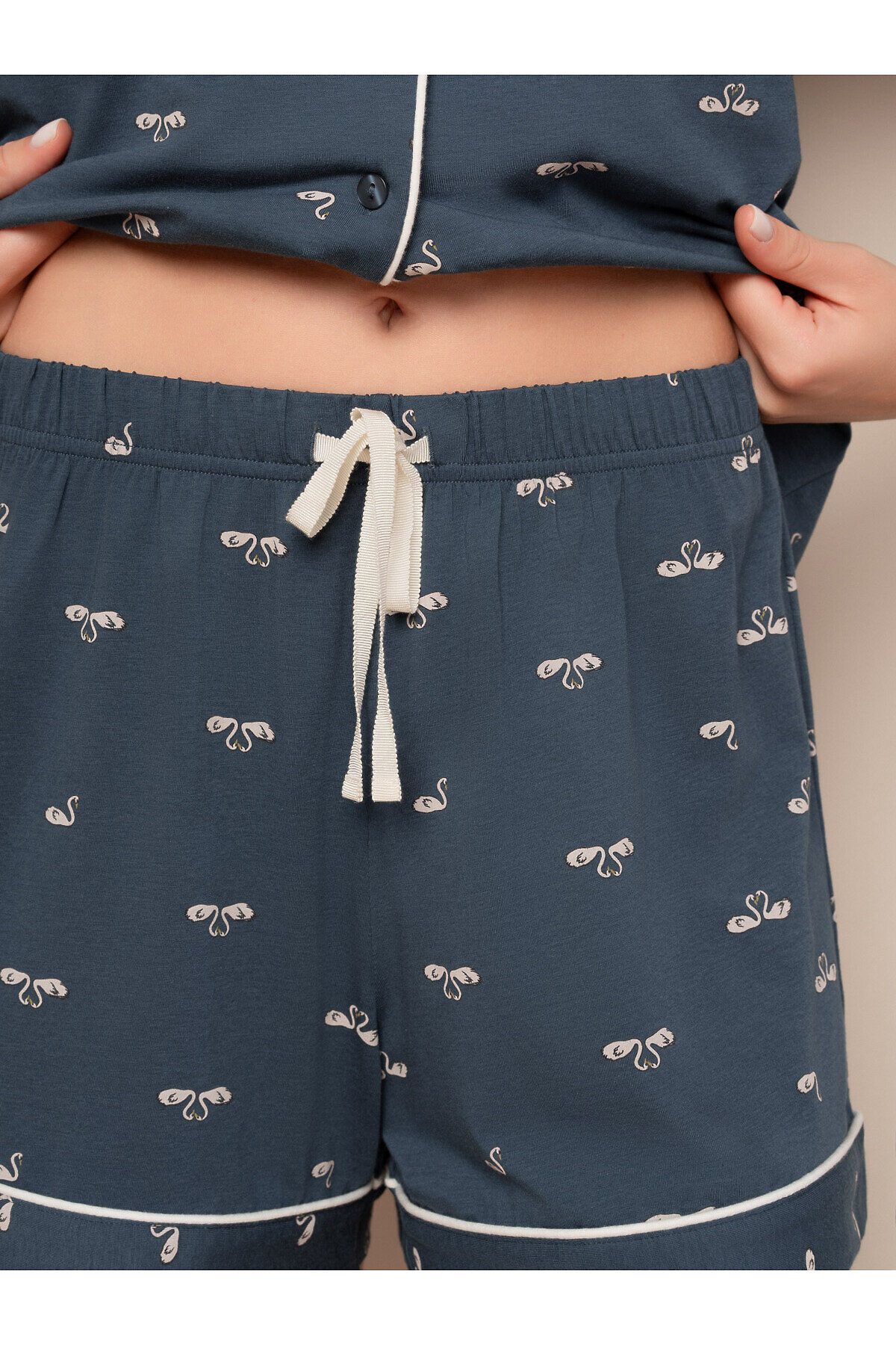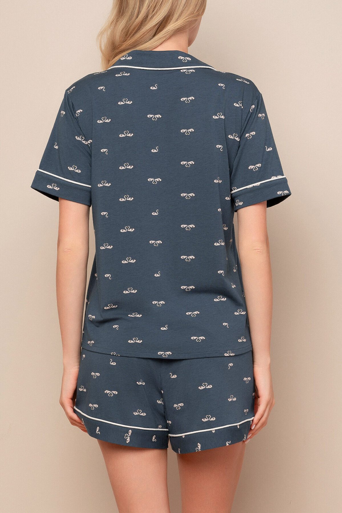 Пижама женская, изготовленная из бамбуко-хлопкового трикотажа, включает футболку свободного кроя с отложным воротником и пуговицами в цвет ткани. Шорты на мягкой резинке с регулирующим поясом надежно сидят на талии. На пижаму нанесен принт с изображением лебедей.