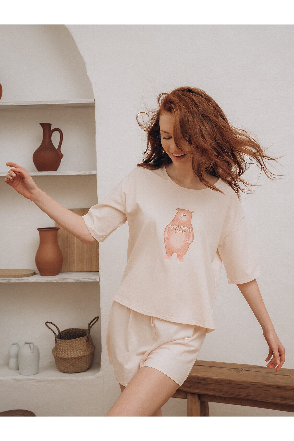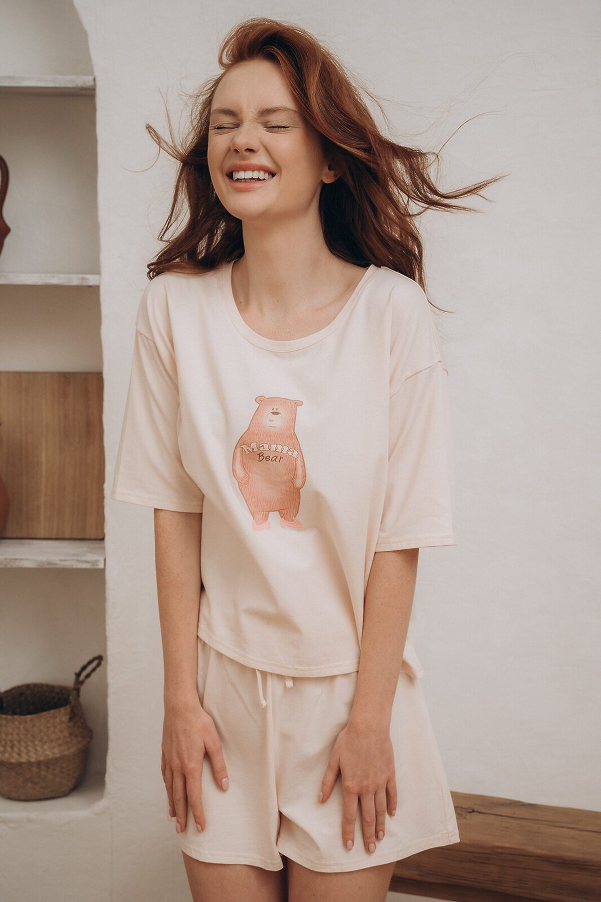 Пижама женская изготовлена из хлопкового трикотажа и выполнена в персиковом цвете. Пижама состоит из футболки свободного кроя с короткими рукавами и округлым вырезом. Шорты имеют мягкую резинку и шнурок, позволяющий регулировать степень обхвата талии. На футболку нанесен принт с изображением медведя, имеющий обрамление в виде вышивки.