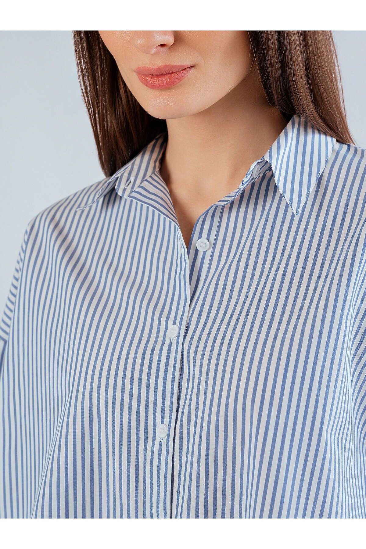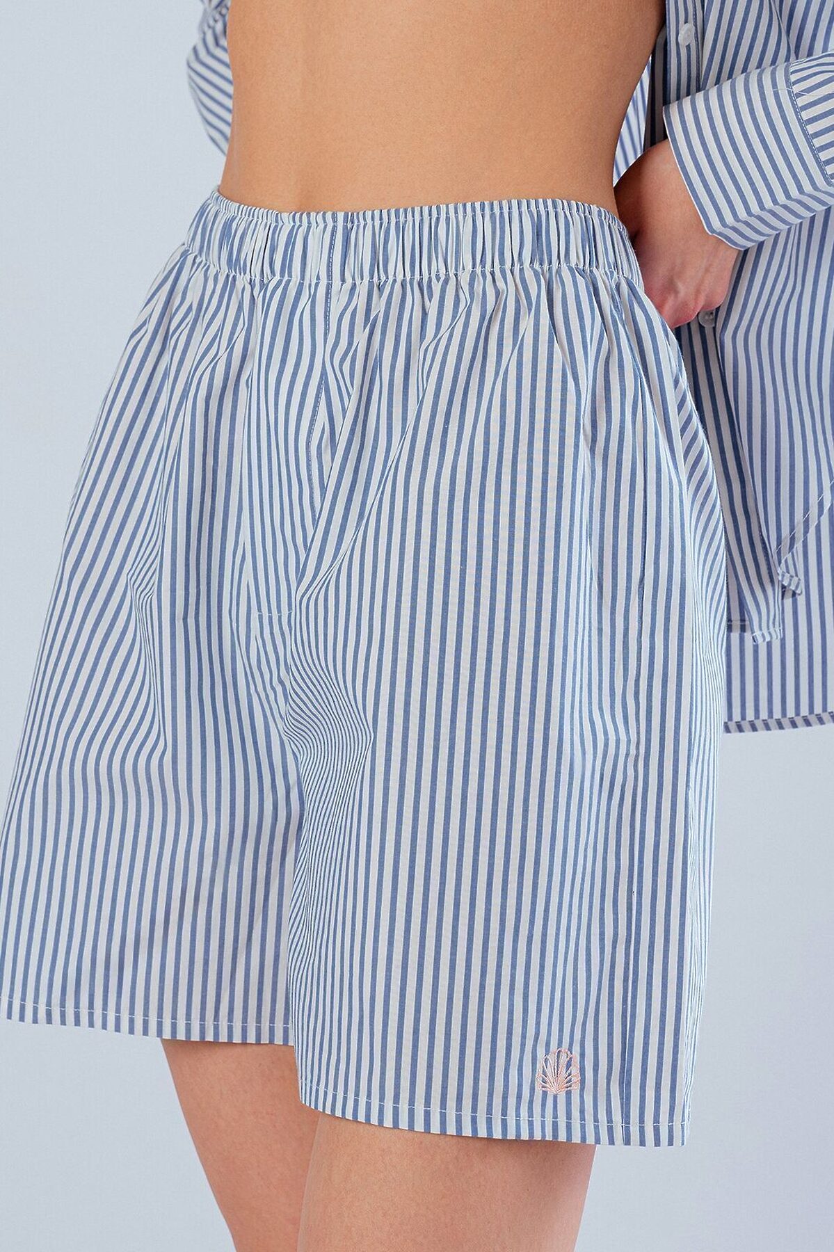 Пижама женская 5038TQP бренда Indefini изготовлена из хлопковой ткани. Украшена принтом в сине-белую полоску. В комплекте рубашка и шорты. Рубашка прямого кроя на пуговицах имеет длинные рукава и отложной воротник. Шорты имеют мягкую широкую резинку на талии. На нижней боковой части шорт имеется декоративная вышивка в виде ракушки.
