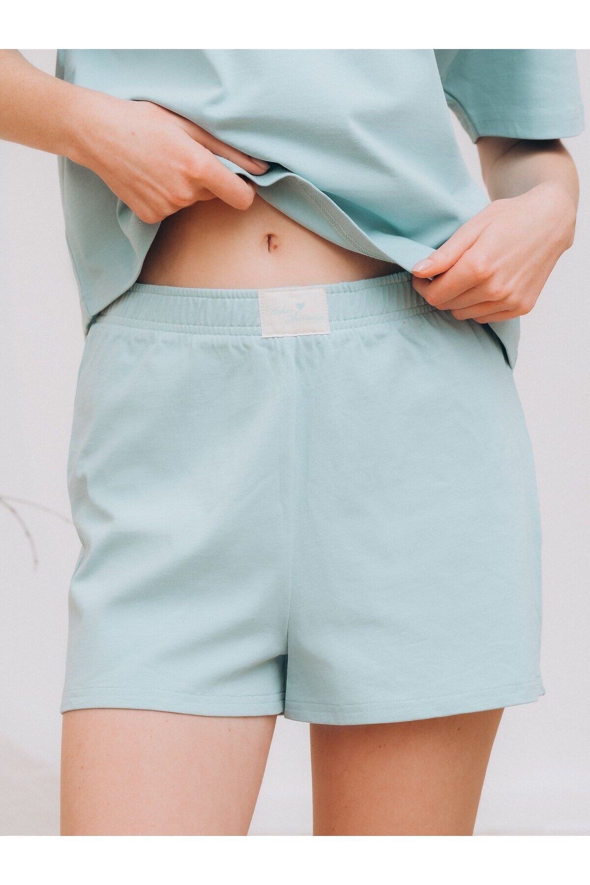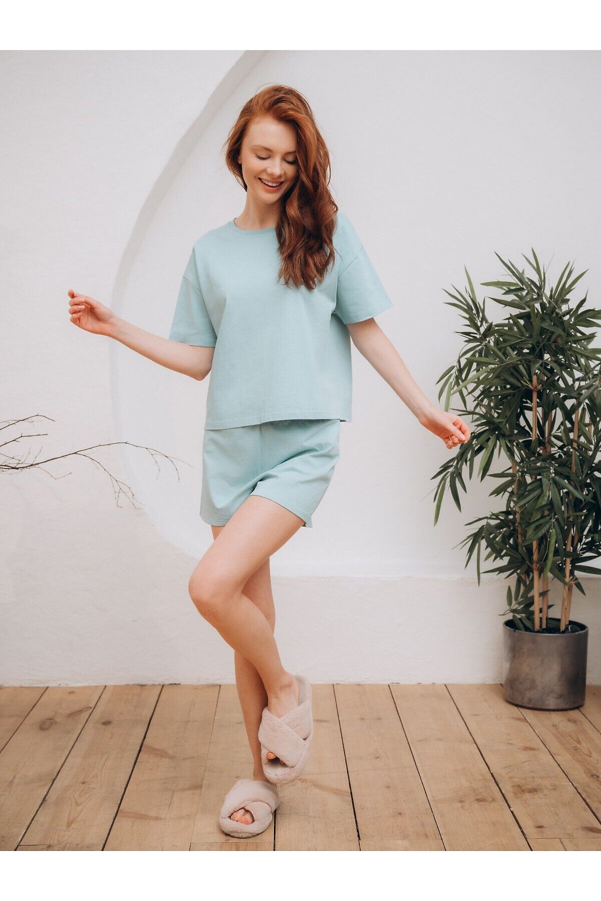 Пижама женская 5061TBD бренда Indefini изготовлена из хлопкового трикотажа. Выполнена в бирюзовом цвете. Пижама состоит из футболки и шорт. Футболка имеет прямой крой, короткие рукава и округлый вырез. На груди сбоку футболки вышита надпись. Шорты на мягкой эластичной резинке, украшенная декоративной этикеткой спереди.