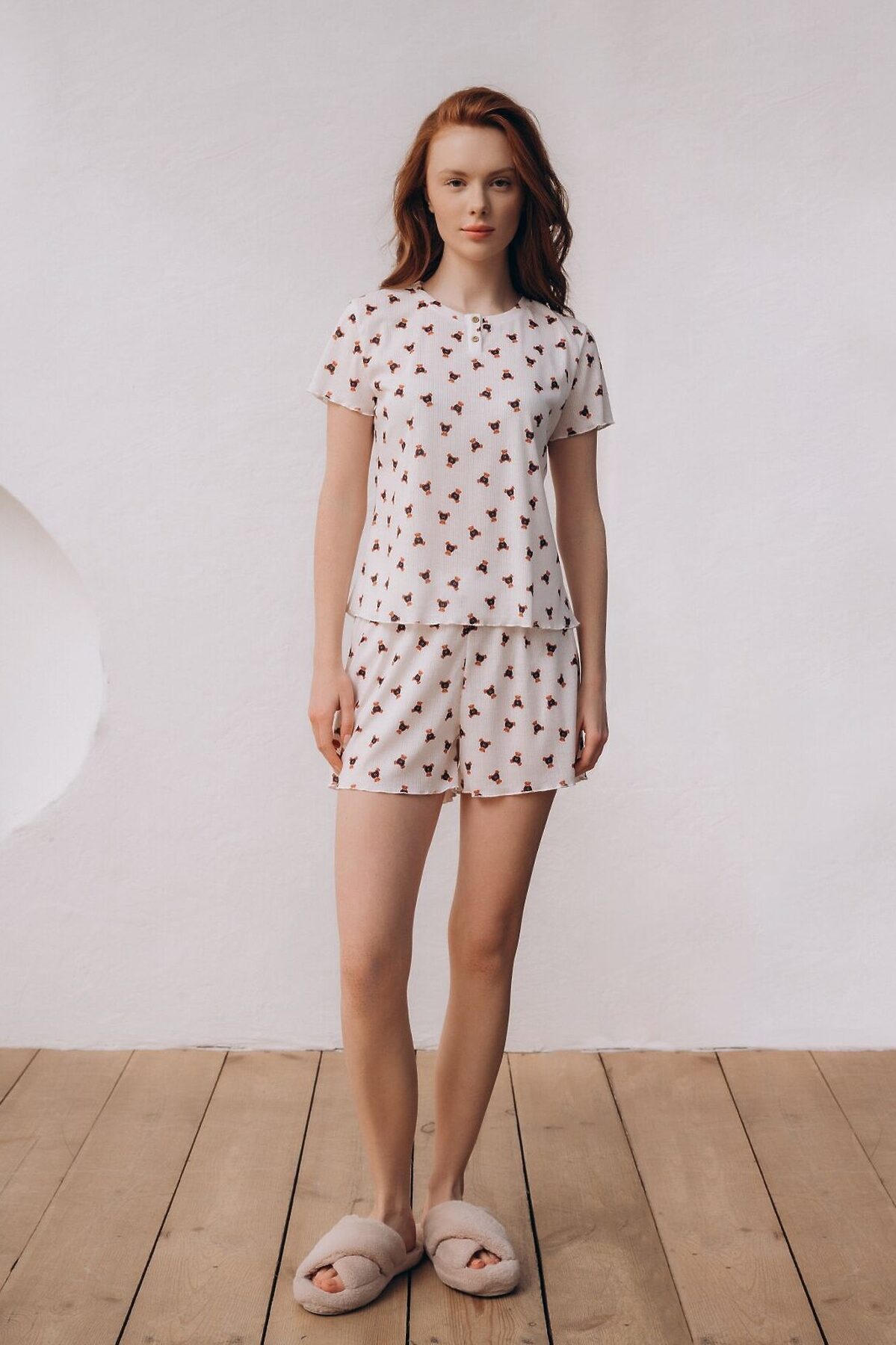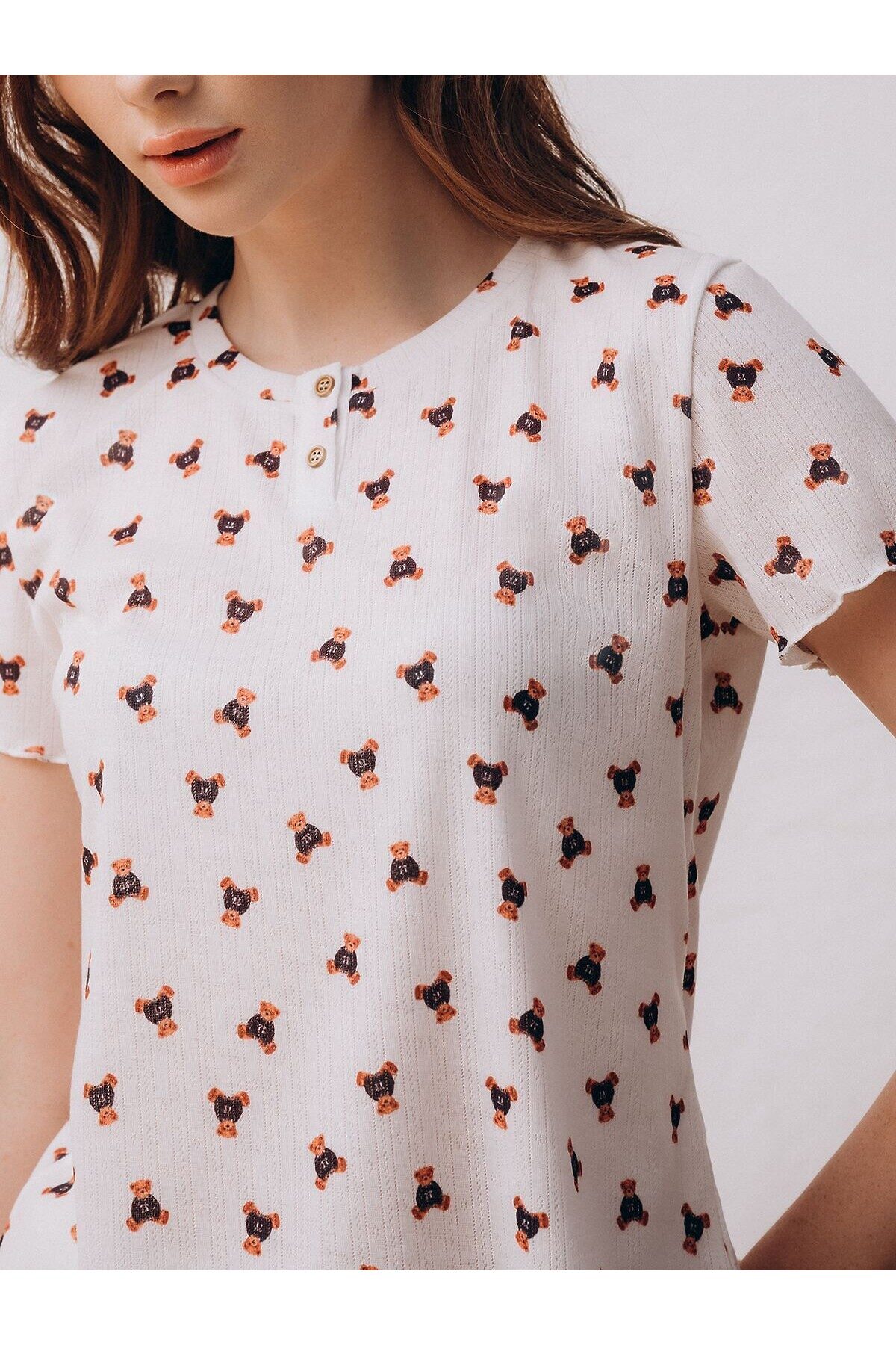 Пижама женская 5055TBD бренда Indefini изготовлена из полиэстера. Пижама выполнена в классическом белом цвете. В комплекте идут футболка и шорты. Футболка прямого кроя с длинными рукавами и округлым вырезом. Верхняя часть футболки застёгивается на две пуговицы. Шорты держатся на талии мягкой эластичной резинкой. Пижама украшена принтом с изображением плюшевых мишек.