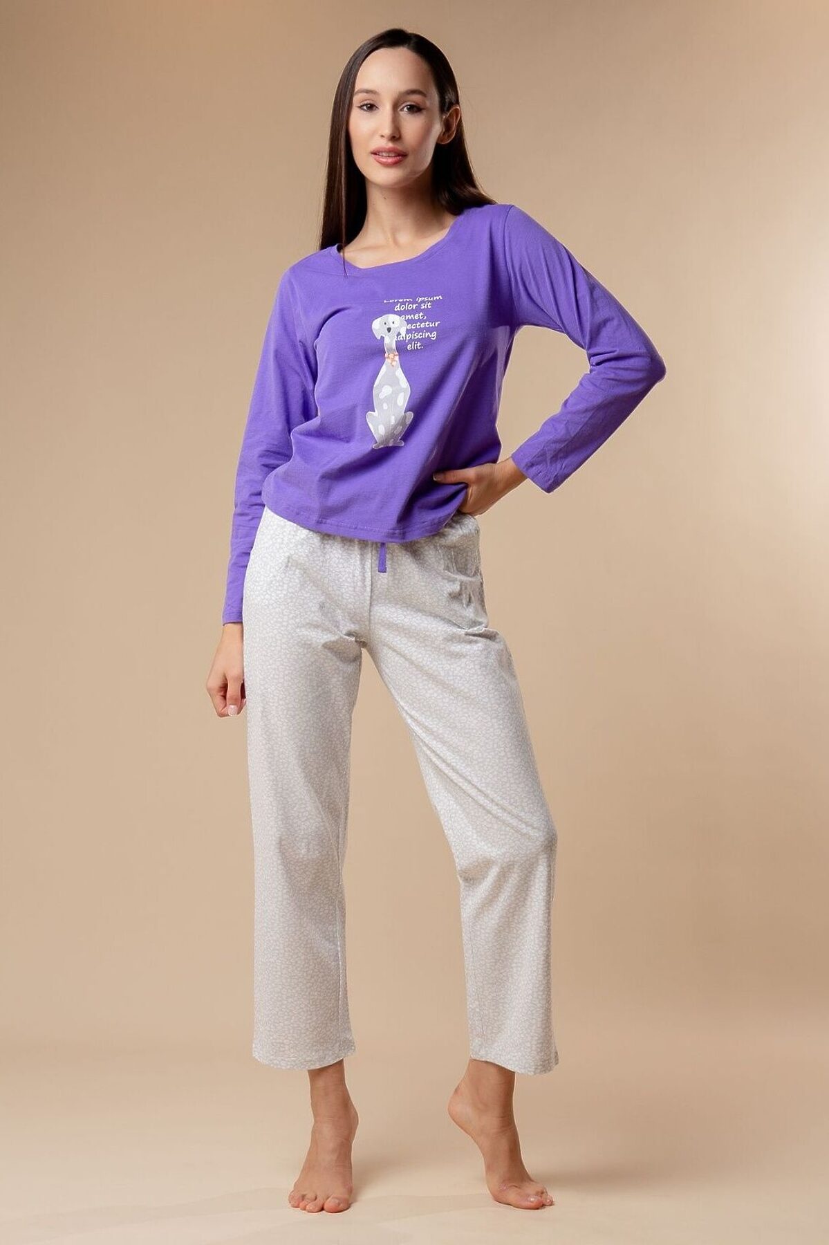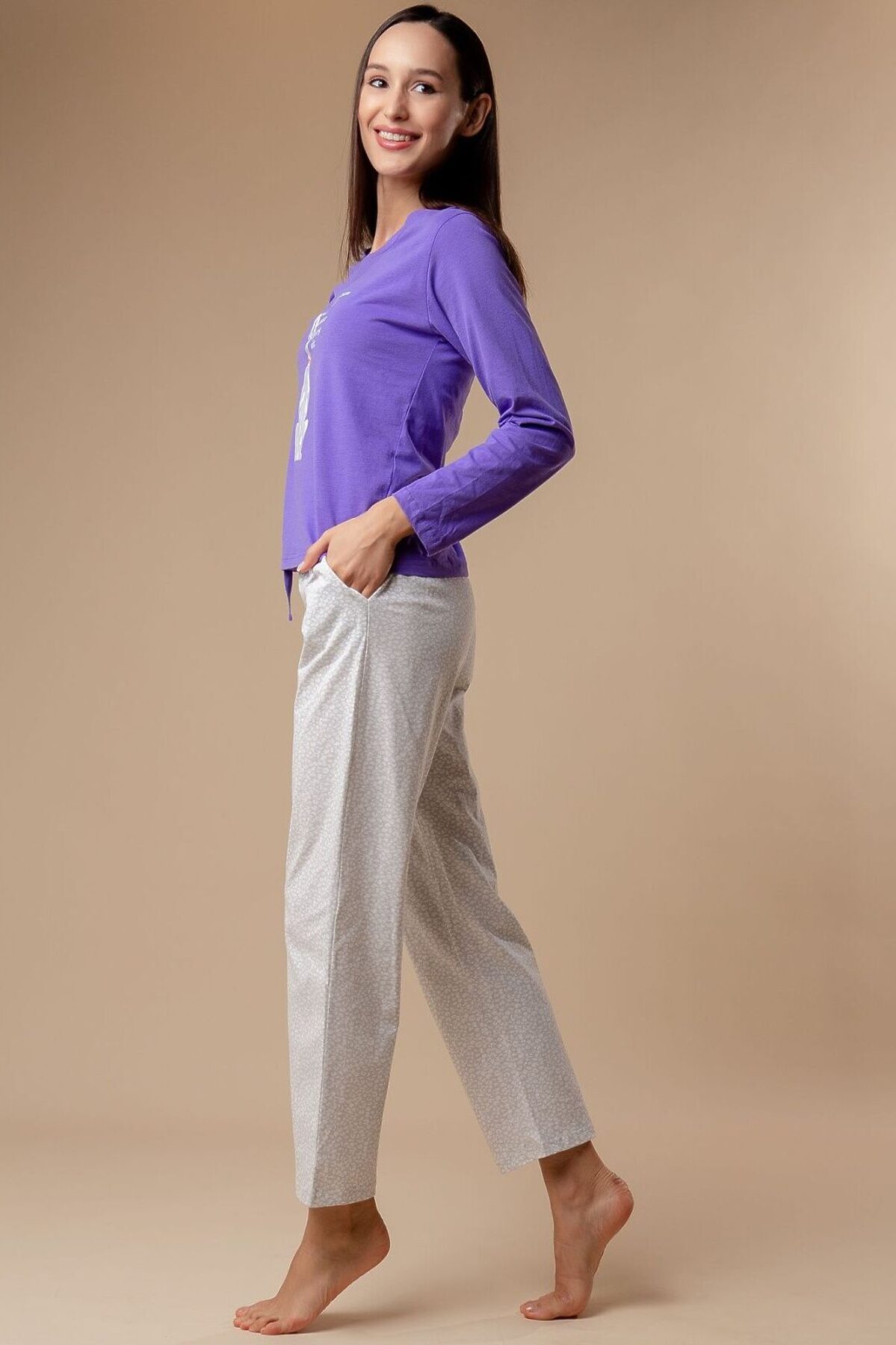 Домашняя пижама (Арт. 3228TCC) от торговой марки Indefini. В комплекте кофта и брюки. Кофта из хлопка, фиолетового цвета, с принтом и надписью, с длинными рукавами, прямая, свободного кроя. Брюки из хлопка, серого цвета, свободного кроя, на мягкой резинке, с регулирующим шнурком.