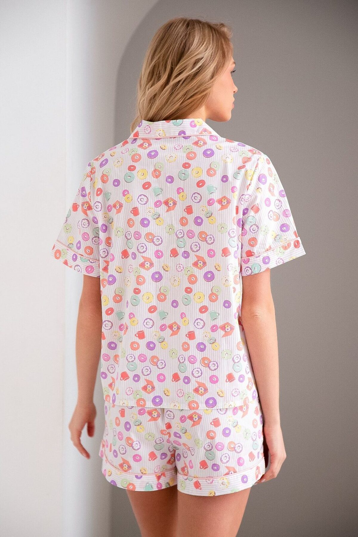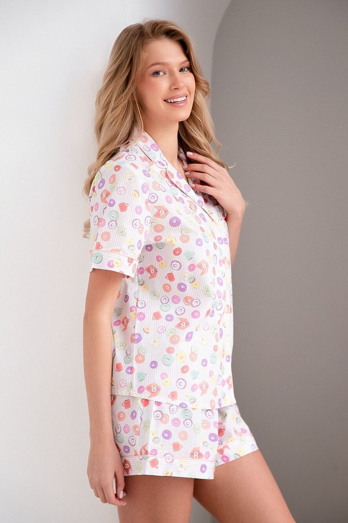 Женская пижама из хлопковой ткани мягкая на ощупь и приятно чувствуется на коже. Материал позволяет пропускать воздух к телу и впитывать влагу, благодаря чему ощущается комфорт при носке. Пижама включает в себя футболку с короткими рукавами, отложным воротником, пуговицами и нагрудным кармашком. В комплекте также есть шорты на широкой эластичной резинке, обеспечивающая надёжную посадку на талии. Украшением пижамы является принт «пончики».