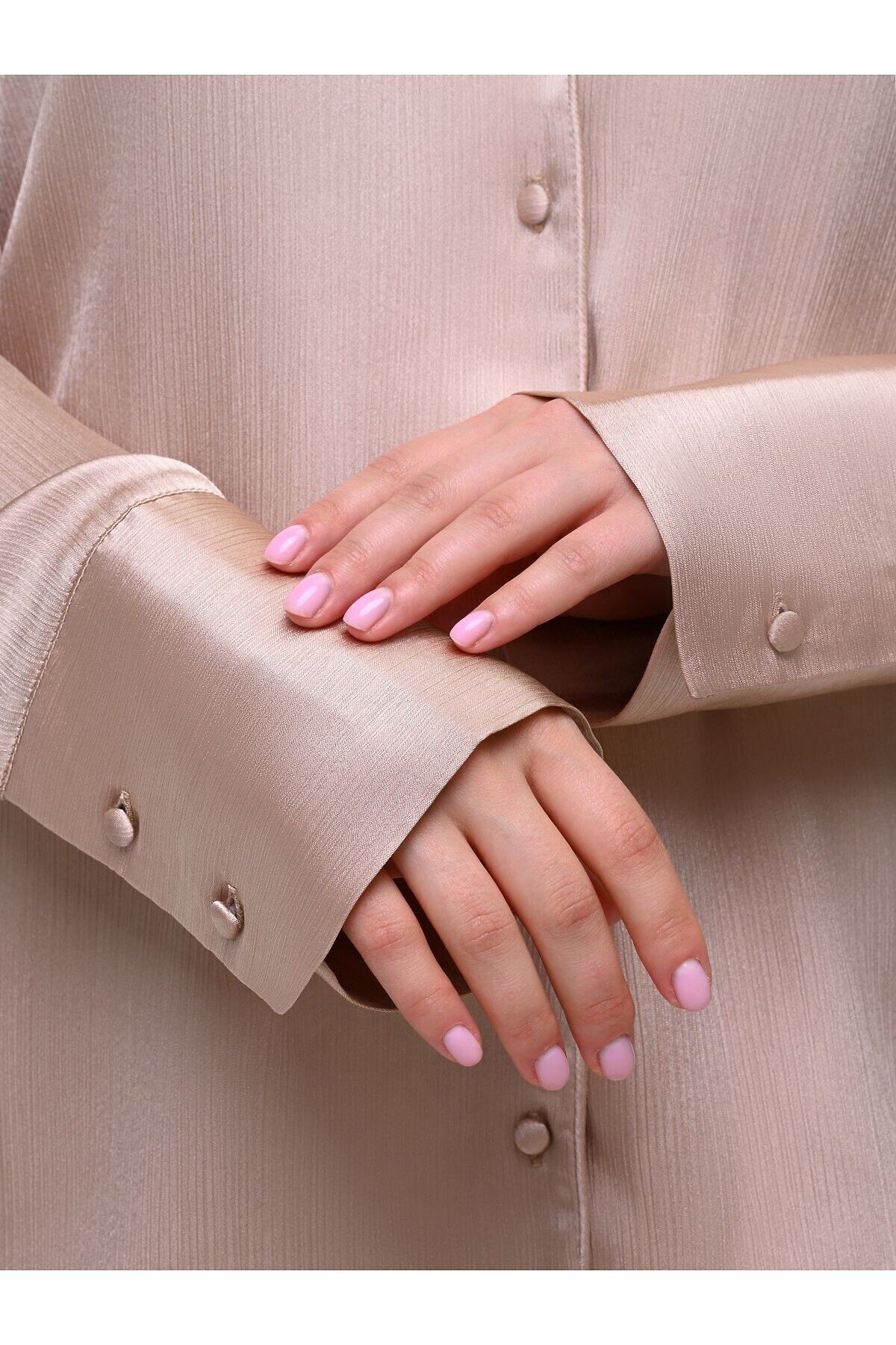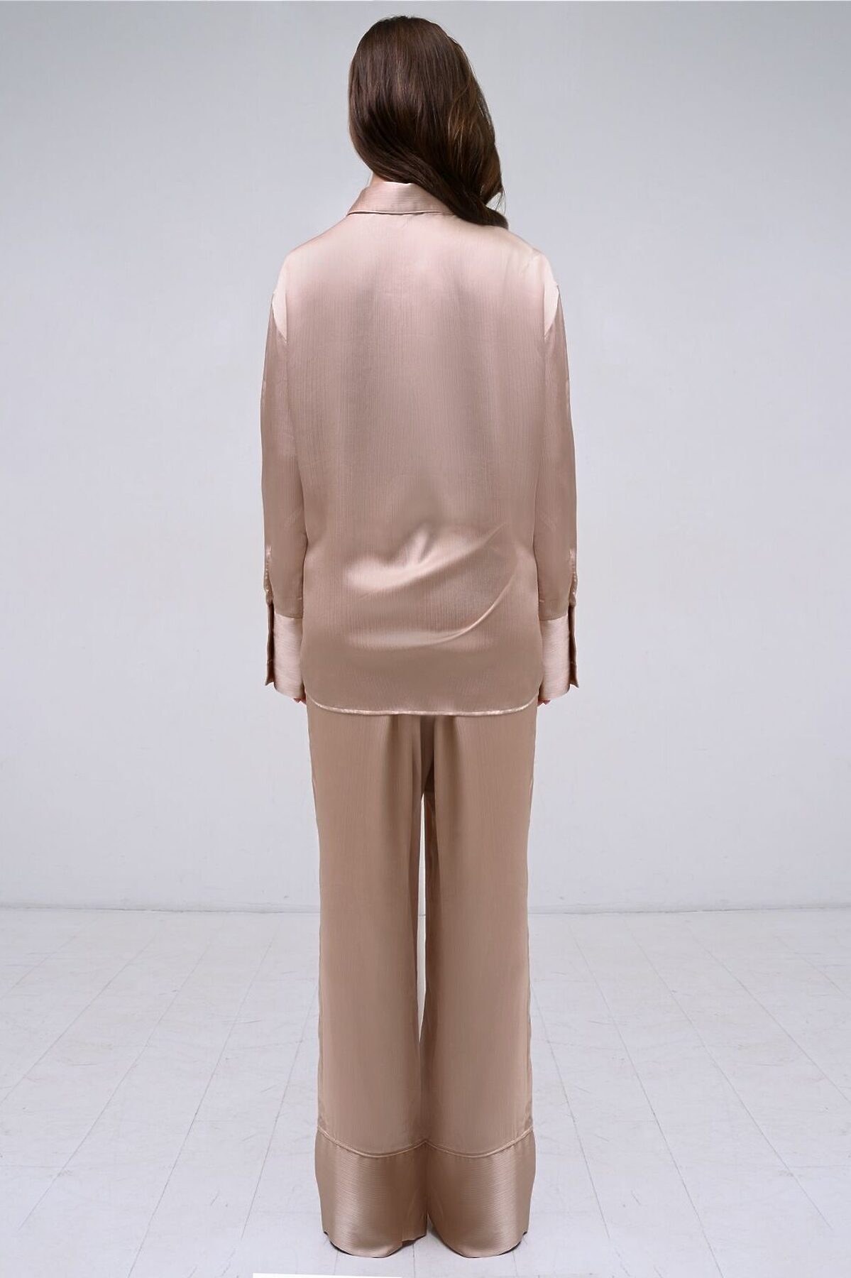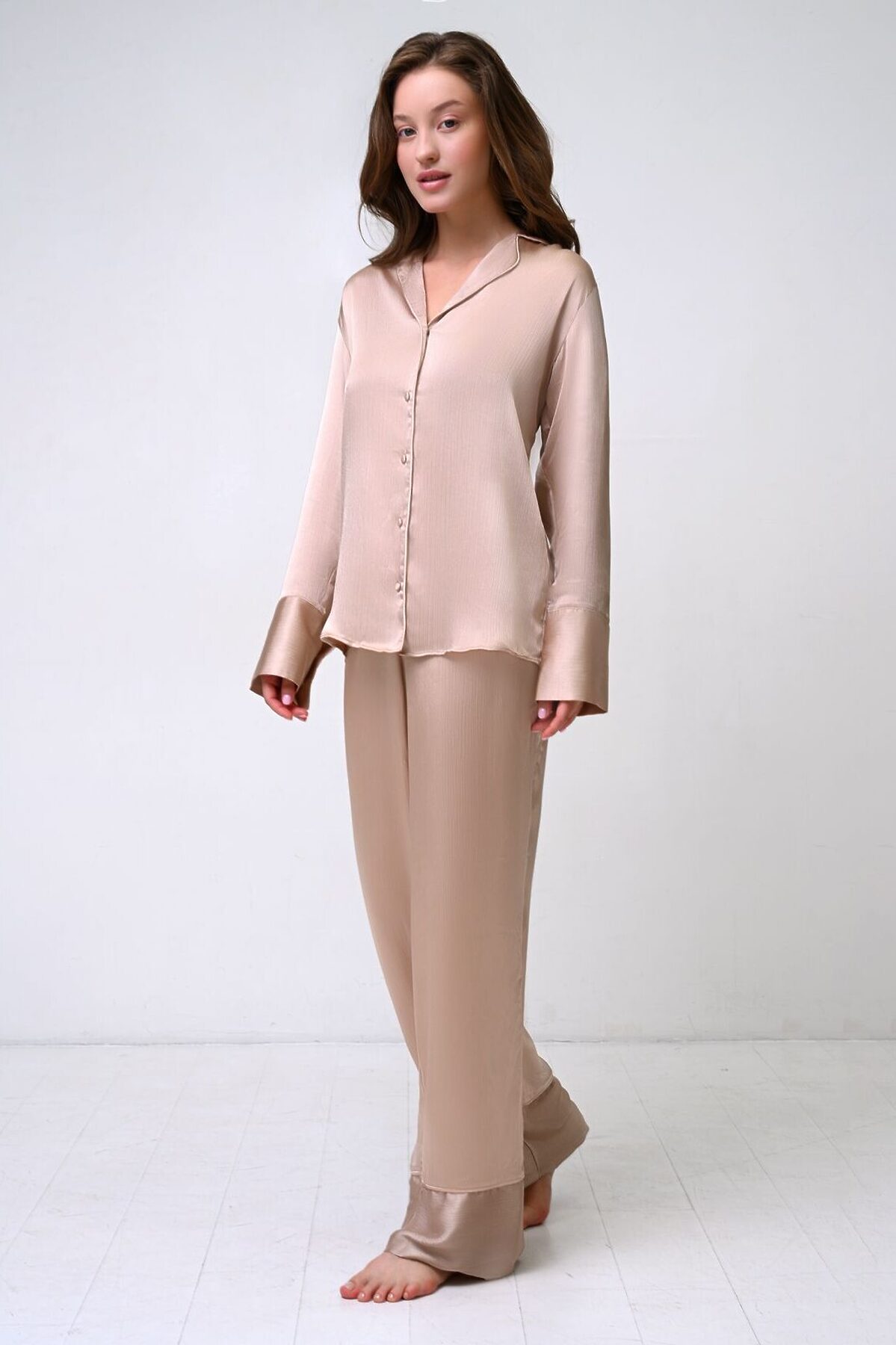 Пижама выполнена из высококачественного, шелковистого на ощупь материала, который создаёт ощущение лёгкости и комфорта. Нежный бежевый оттенок добавляет образу утончённости, делая пижаму универсальным выбором для любого времени года. Верх оснащён классическим отложным воротником и пуговицами, что обеспечивает удобство при надевании и регулировке. Длинные рукава добавляют тепло и уют, а свободный крой обеспечивает комфорт и свободу движений.