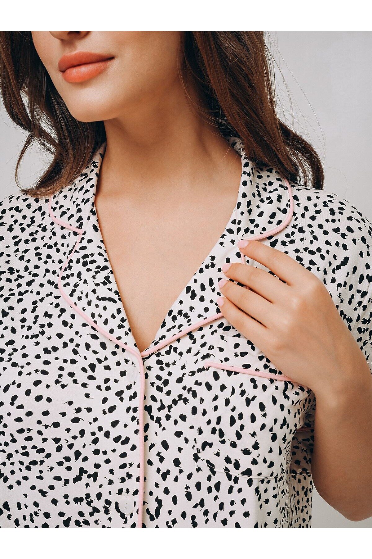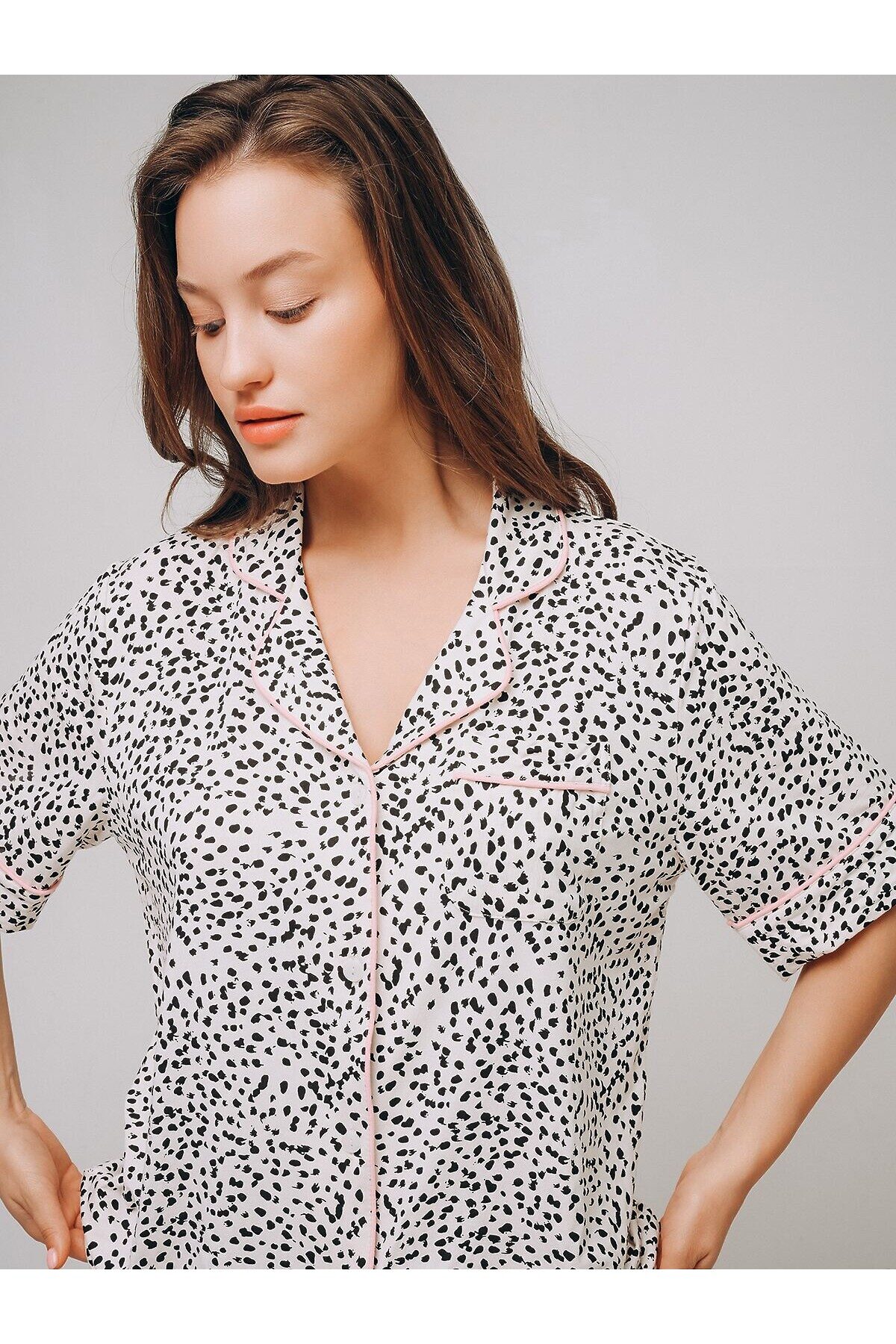 Пижама женская 4177TCC бренда Indefini, изготовленная из мягкой вискозы, нежно окутывает кожу, обеспечивая уют во время носки. Комплект включает прямую футболку с отложным воротником, нагрудным карманом и пуговицами в тон ткани. Свободные прямые брюки на эластичной резинке надежно сидят на талии. Анималистичный принт придаёт пижаме женской Indefini яркий и современный акцент.