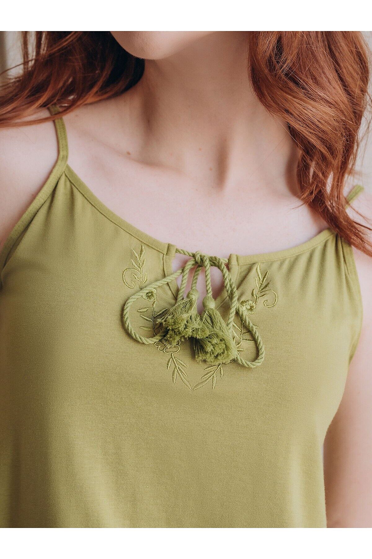 Пижама женская изготовлена из смесового трикотажа. Она состоит из майки и шорт. Майка выполнена в зеленом цвете на тонких регулируемых бретелях. Зона декольте украшена цветочной вышивкой и двумя завязываемыми шнурками с кисточками. Шорты выполнены в белом цвете с абстрактным принтом. Они имеют мягкую эластичную резинку на талии с вязаным регулирующим шнурком с кисточками.