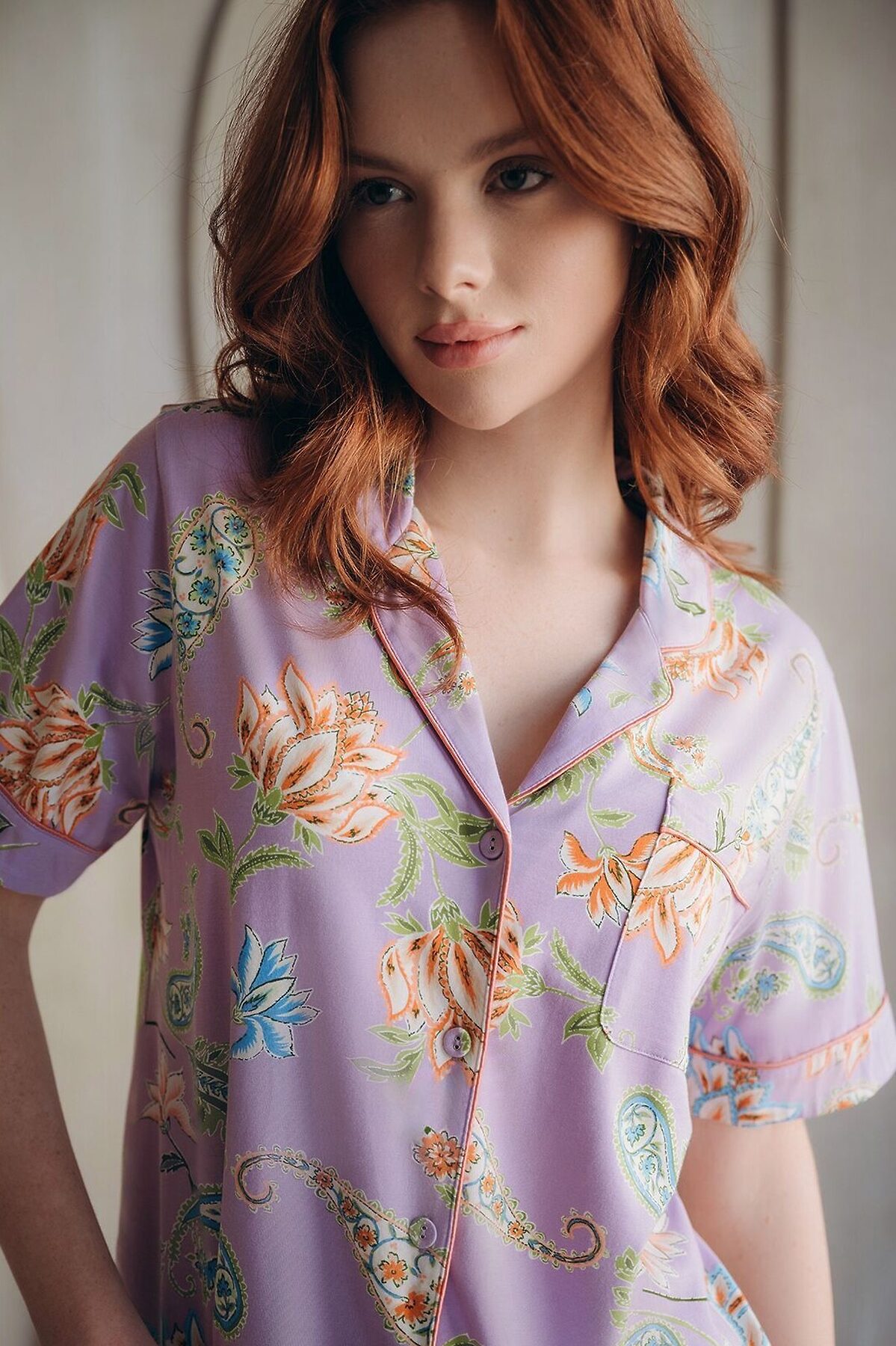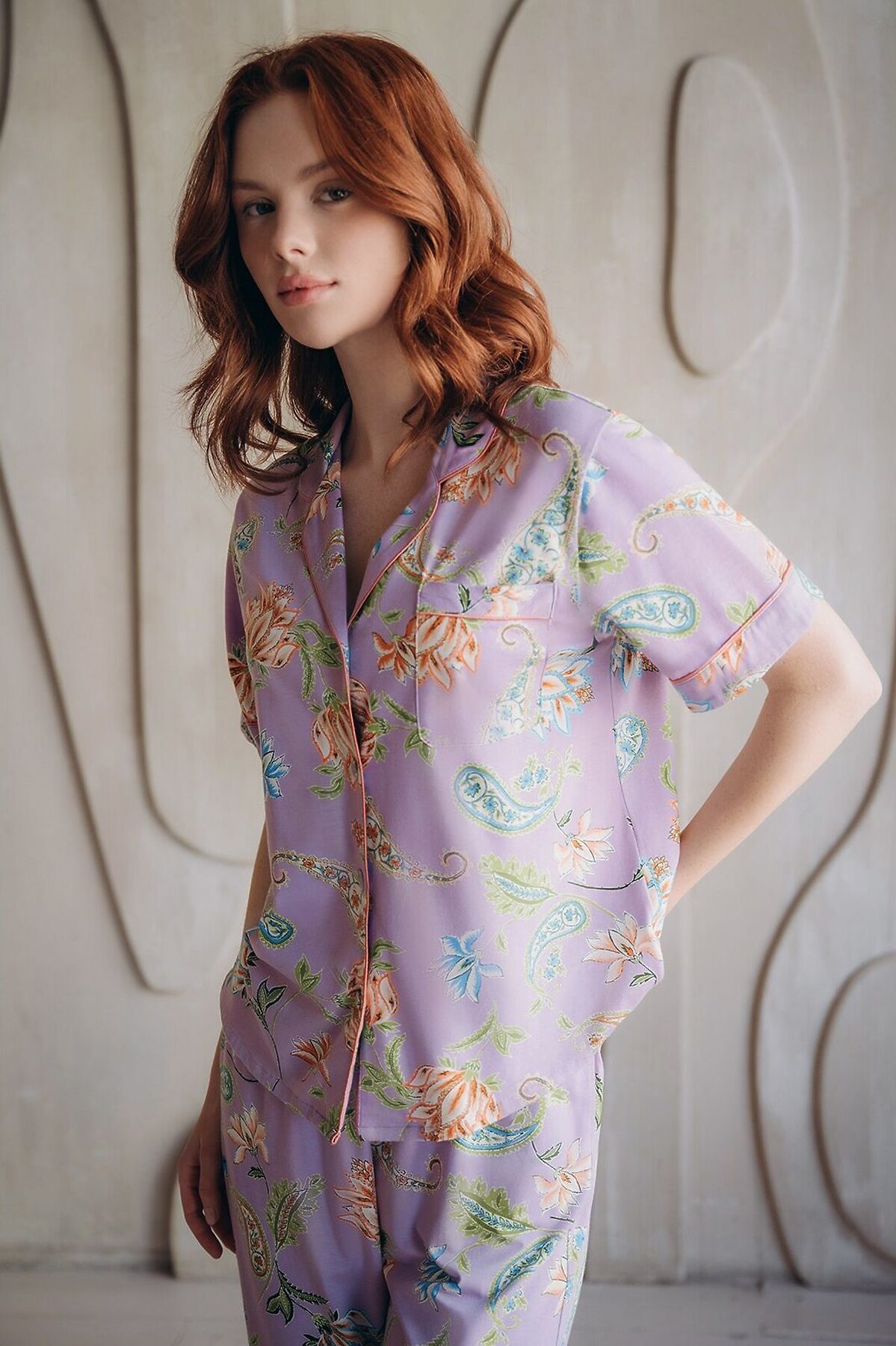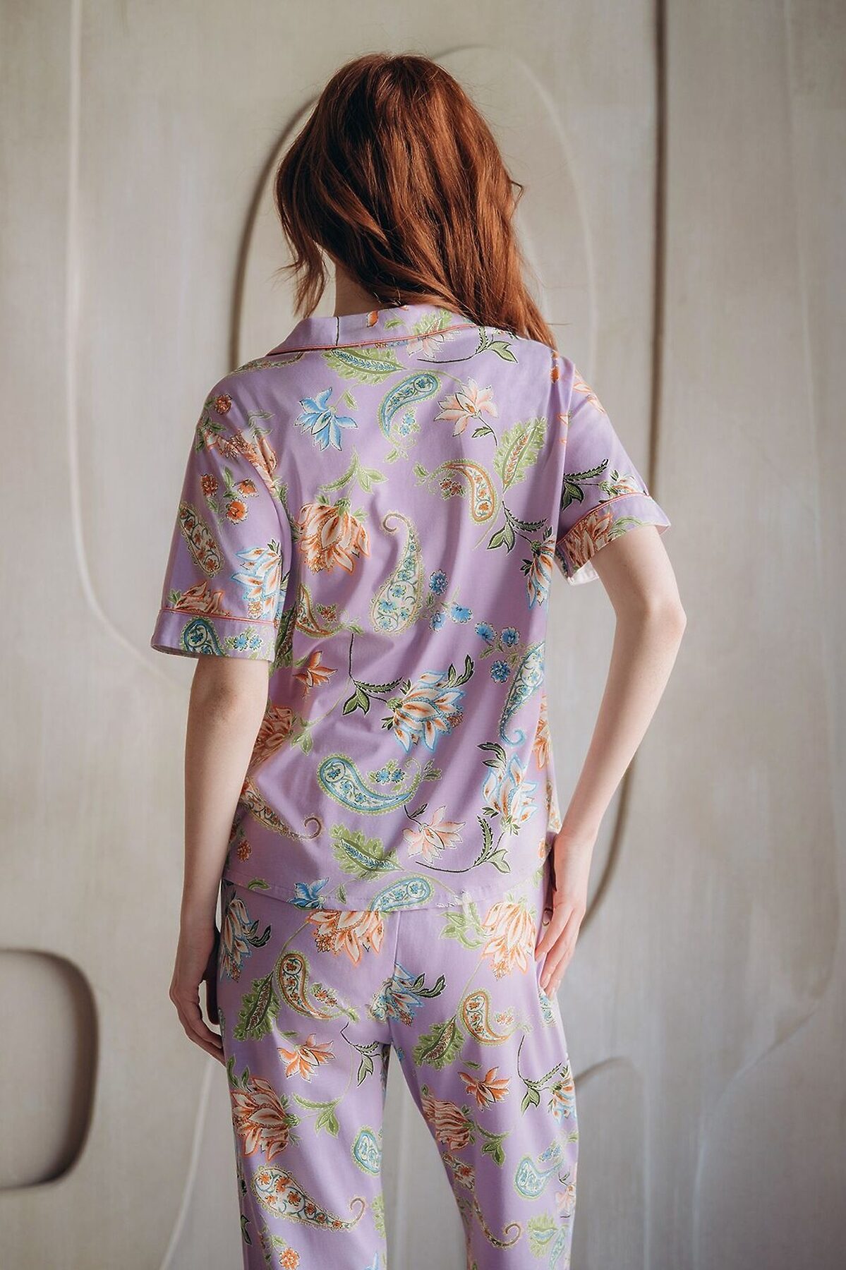 Домашняя пижама от торговой марки Индефини. В комплекте рубашка с брюками. Фиолетовая рубашка с цветочным принтом изготовлена из бамбука с хлопком, с короткими рукавами с окантовкой, с воротником-отворотом, прямая, свободного кроя на пуговичках. Брюки фиолетового цвета с цветочным принтом, с широкими штанинами свободного кроя с окантовкой по низу, фиксируются мягкой резинкой на поясе.