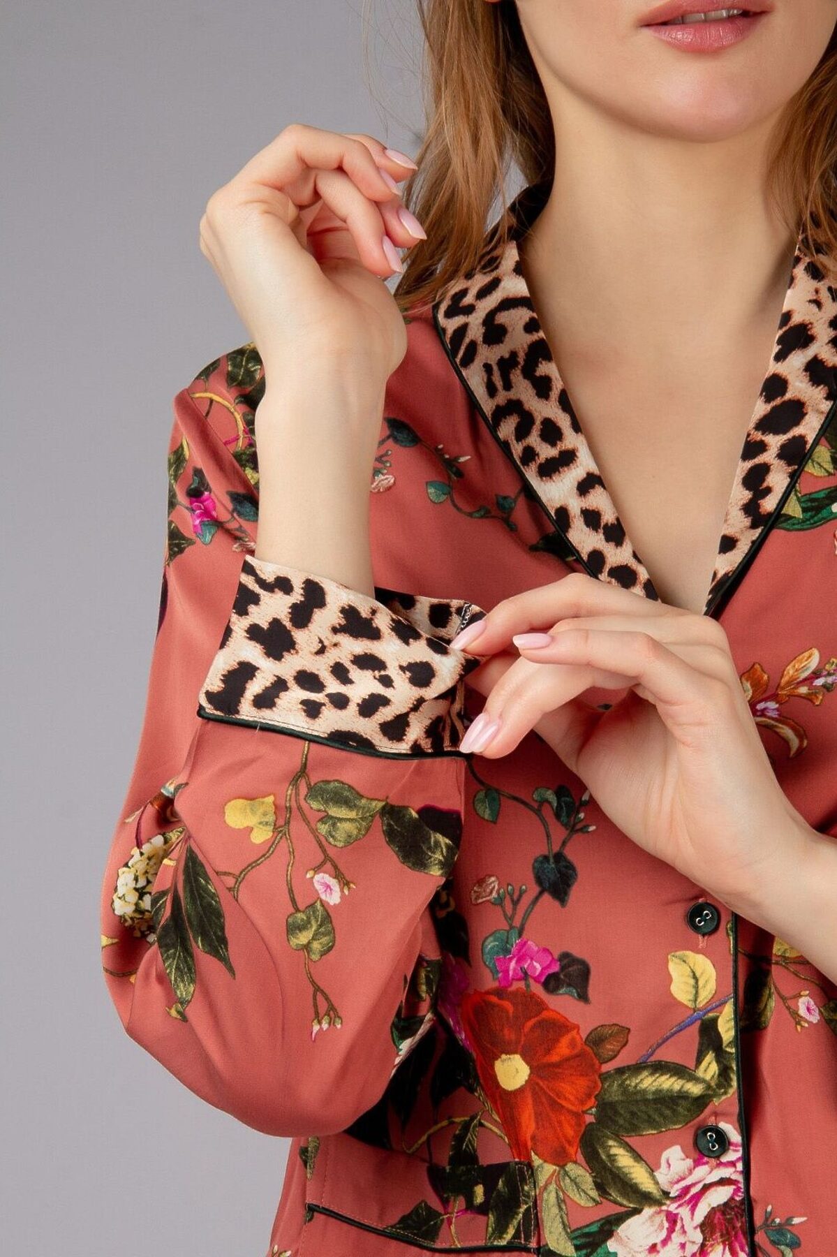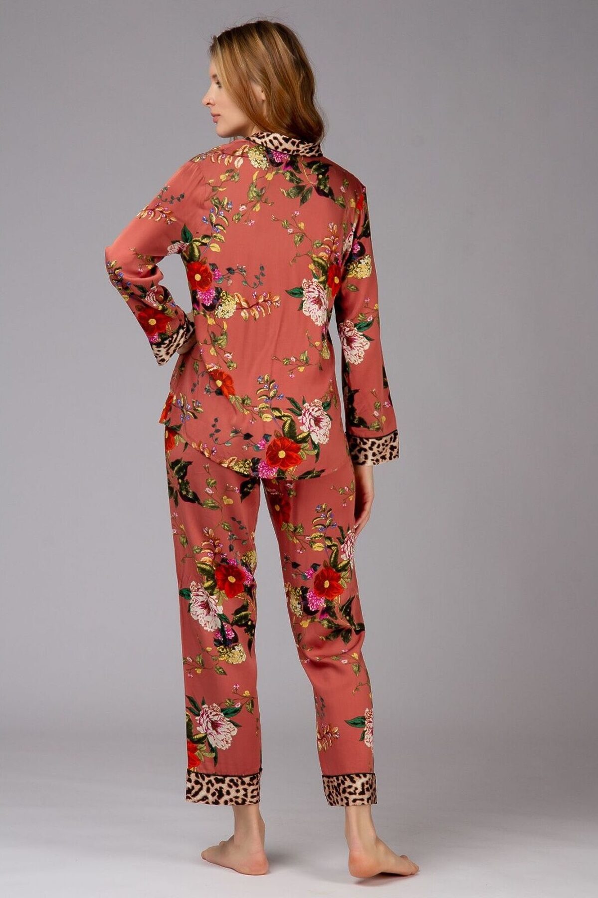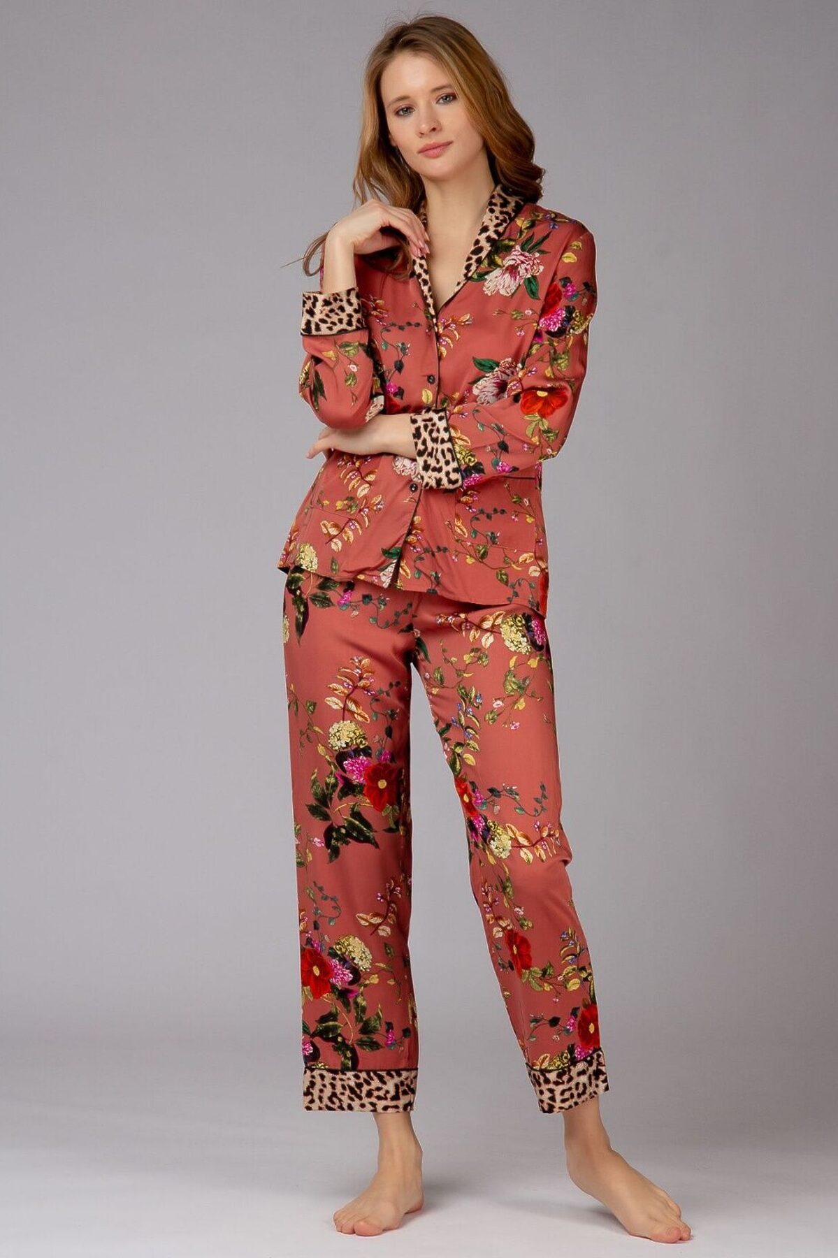 Домашняя пижама от торговой марки Индефини. В комплекте рубашка с брюками. Рубашка из вискозы, красно-коричневого цвета, с цветочным принтом, со вставками леопардового принта, с длинными рукавами, с воротником-отворотом, с кармашками по бокам, на пуговичках, прямая, свободного кроя. Брюки из вискозы, красно-коричневого цвета, с цветочным принтом, со вставками леопардового принта, на мягкой резинке, прямые, свободного кроя.