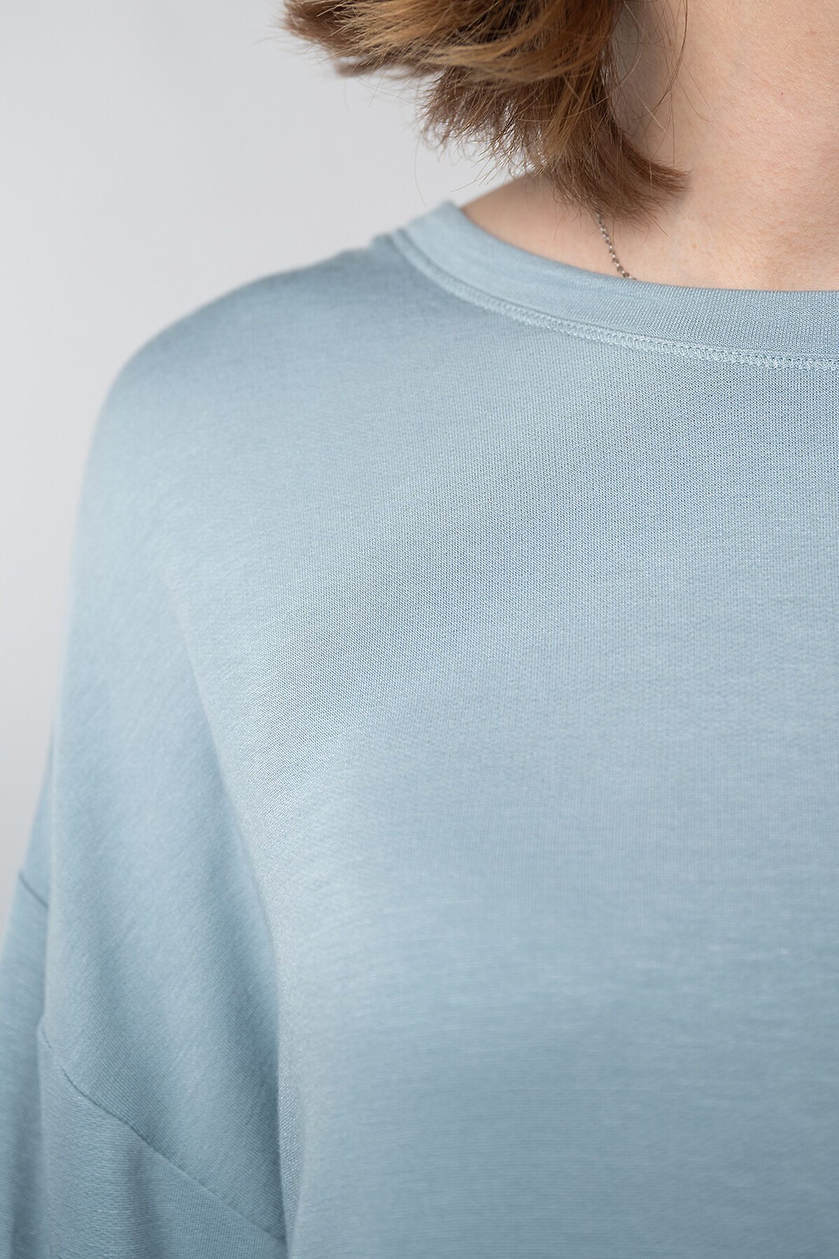 Женская пижама выполнена в нежном голубом цвете и изготовлена из мягкого материала — вискозы с добавлением эластана (95% вискозы, 5% эластана). Особенности дизайна: Кофта: укороченная, с длинными мягкими рукавами. На нижней части кофты есть голубая лента-завязка, которая позволяет регулировать посадку. Брюки: широкие, свободного кроя, что обеспечивает максимальный комфорт. Пояс на мягкой эластичной резинке Материал приятный к телу, дышащий и эластичный, что делает пижаму идеальной для сна и отдыха. Свободный крой и мягкие ткани обеспечивают комфорт даже при длительном ношении.