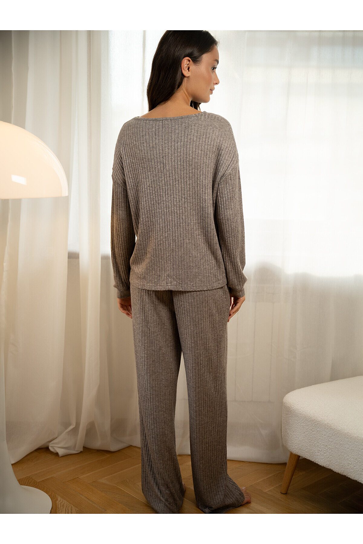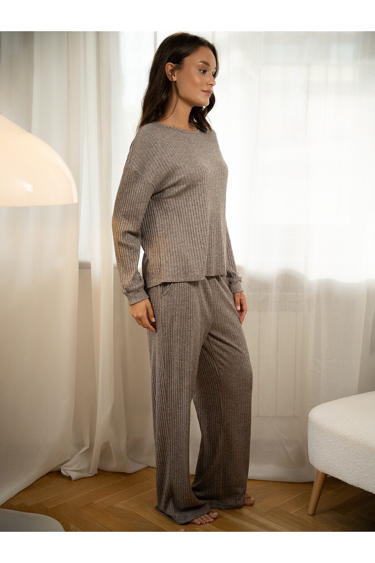 Женская пижама бренда Indefini теплого серого цвета — идеальный выбор для уютных вечеров и комфортного сна. Состоит из верхней части с длинными рукавами и удобных брюк, обеспечивающих свободу движений. Мягкая и нежная ткань деликатно облегает тело, создавая ощущение тепла и комфорта. Безупречный крой и спокойный бежевый оттенок придают образу нежность и элегантность. Пижама легко сочетается с домашним халатом и тапочками, оставаясь стильным и функциональным элементом домашнего гардероба. Параметры модели на фото: 88-60-89 Рост модели на фото: 173 см