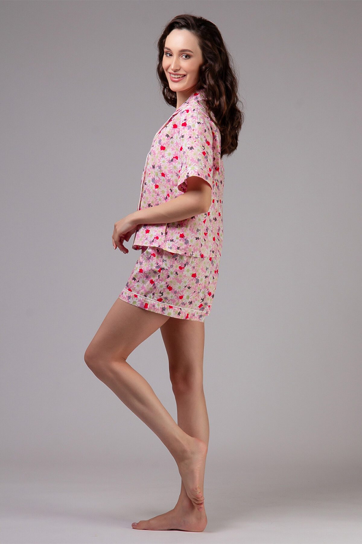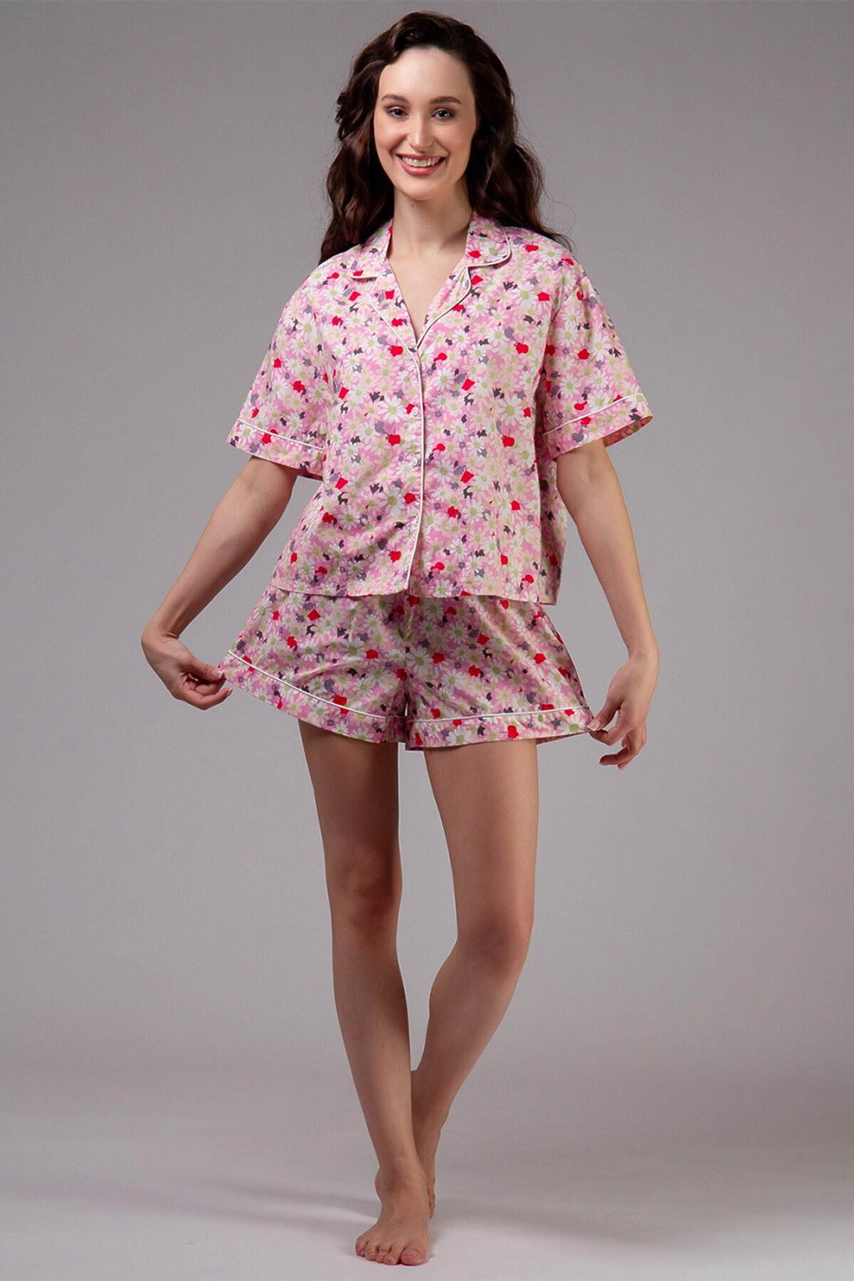 Домашняя пижама от торговой марки Индефини. В комплекте рубашка и шорты. Рубашка из хлопка, розового цвета, с цветочным принтом, с короткими рукавами, с воротником-отворотом, с обрамлением, на пуговичках, прямая, свободного кроя. Шорты из хлопка, розового цвета, с цветочным принтом, с обрамлением, прямые, свободного кроя, на мягкой резинке, с регулирующей лентой.