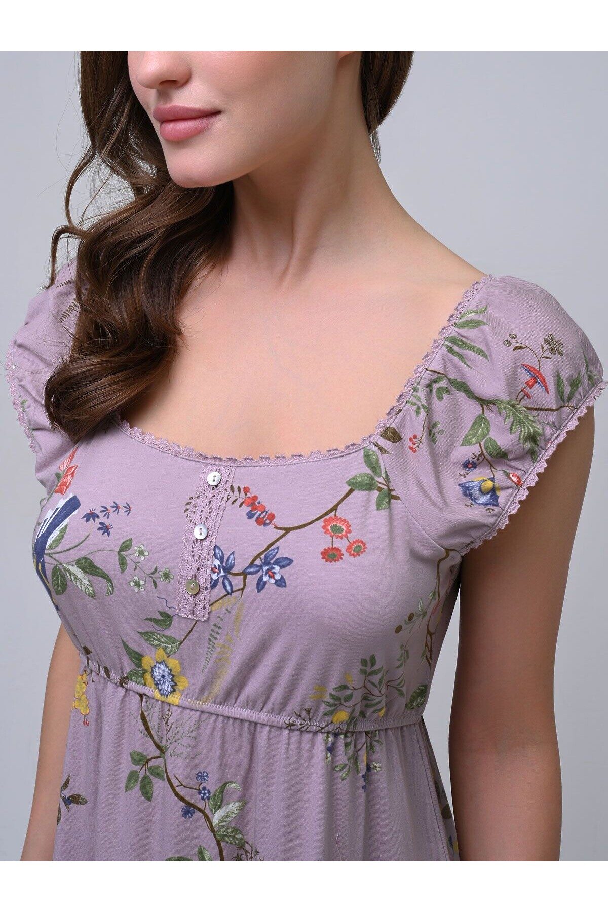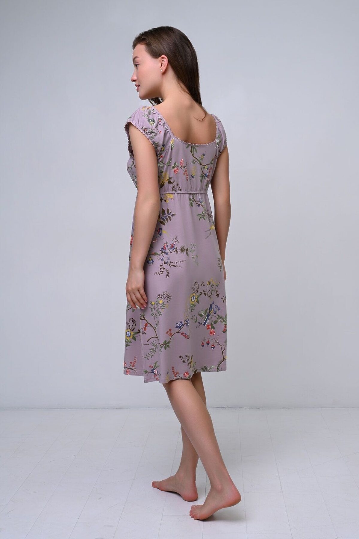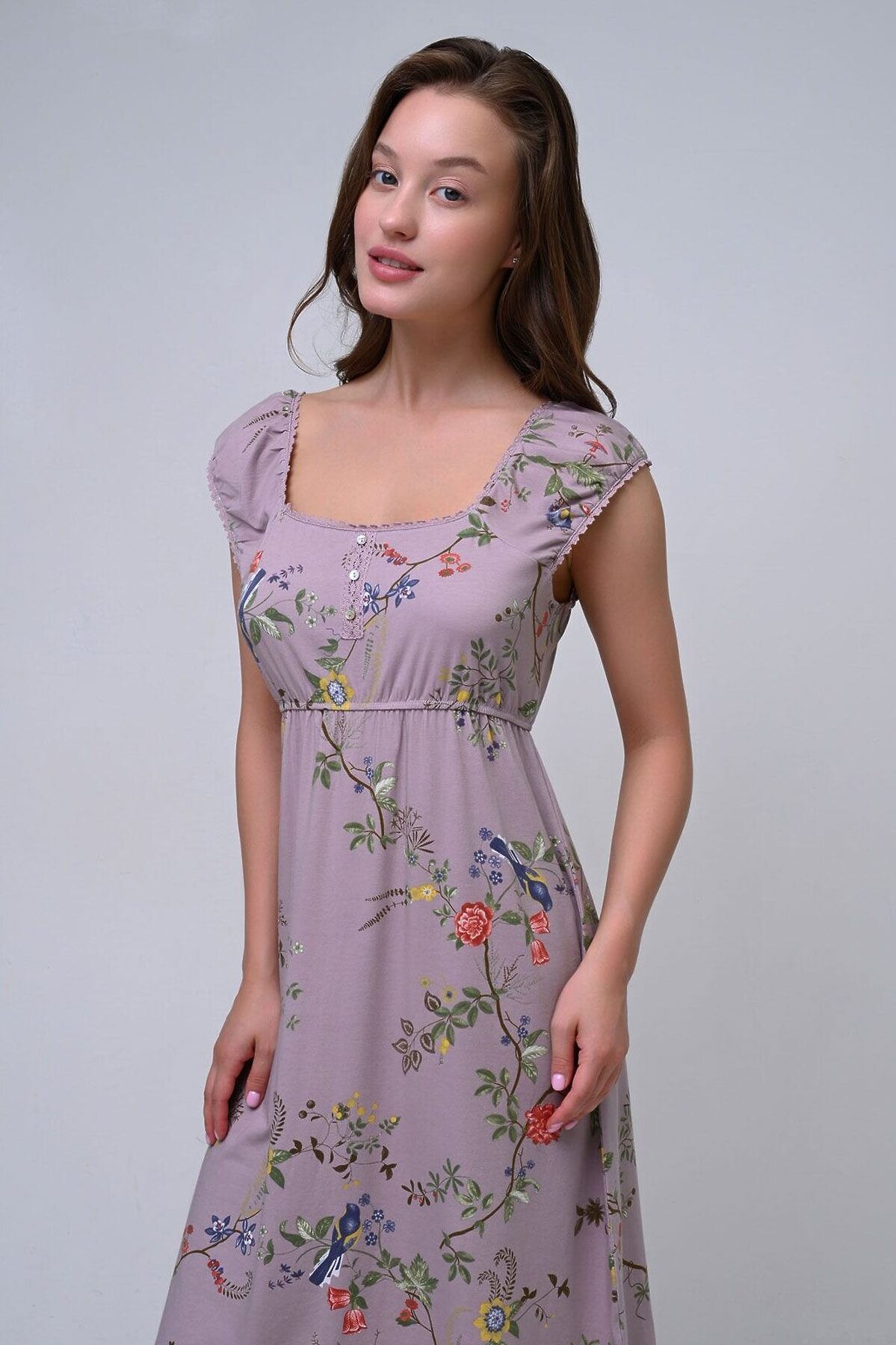 Сорочка свободного кроя изготовлена из бамбуко-хлопкового трикотажа, который сочетает в себе мягкость и воздухопроницаемость бамбука с прочностью и гигроскопичностью хлопка. С широкими бретелями, обрамленными кружевом, она добавляет романтичный акцент образу. Тонкая эластичная резинка в области груди подчеркивают фигуру, обеспечивая при этом удобную посадку. Цветочный принт добавляет изделию свежести и романтичности. Сорочка подходит для прогулок по городу, отдыха на природе или домашнего уюта.