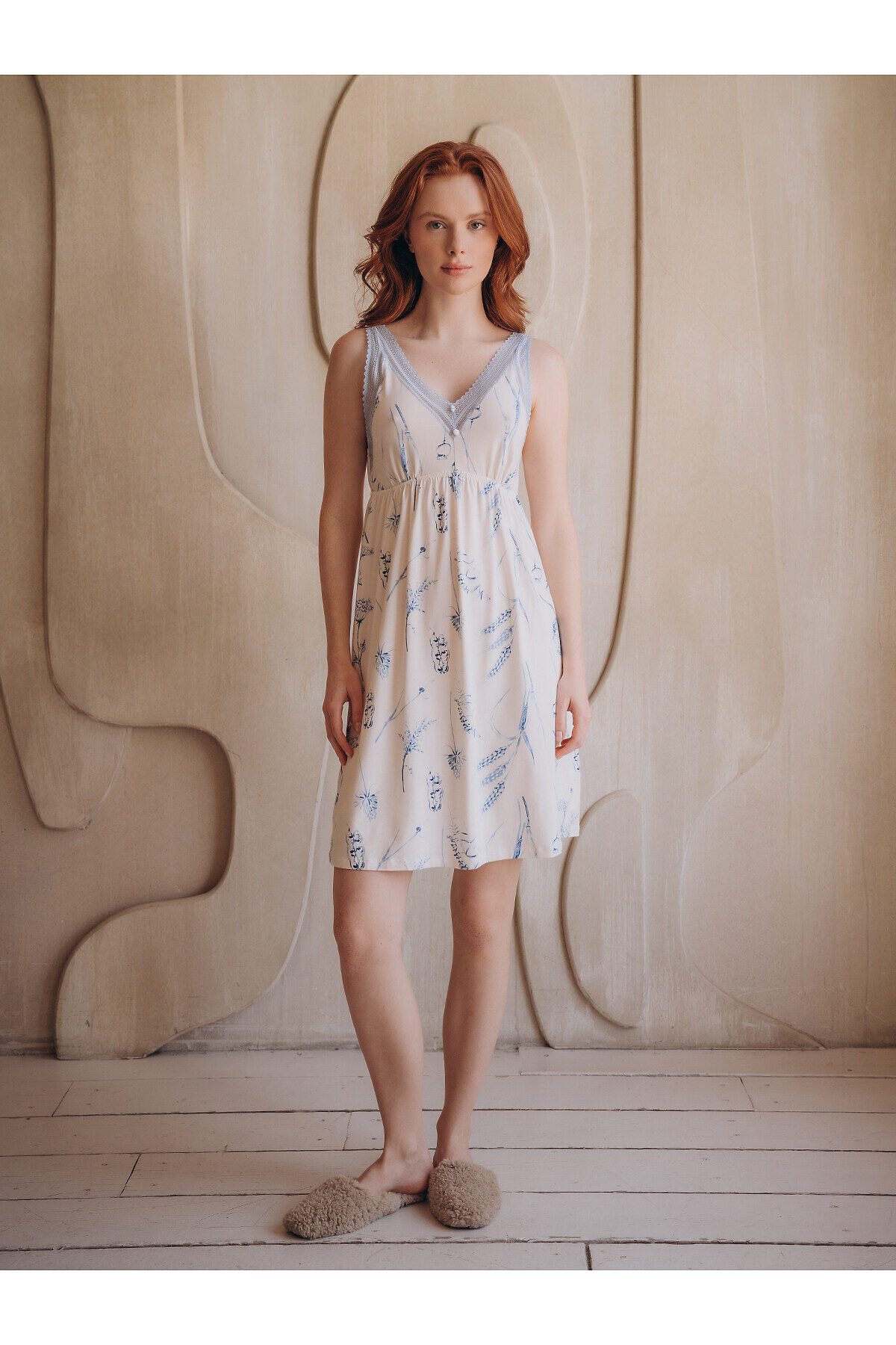 Сорочка женская изготовлена из смесового трикотажа, выполнена в белом цвете с нанесенным синим цветочным принтом. Широкие нерегулируемые бретели выполнены с кружевом. В зоне декольте имеются две декоративные пуговицы. В области груди расположена тонкая эластичная резинка.