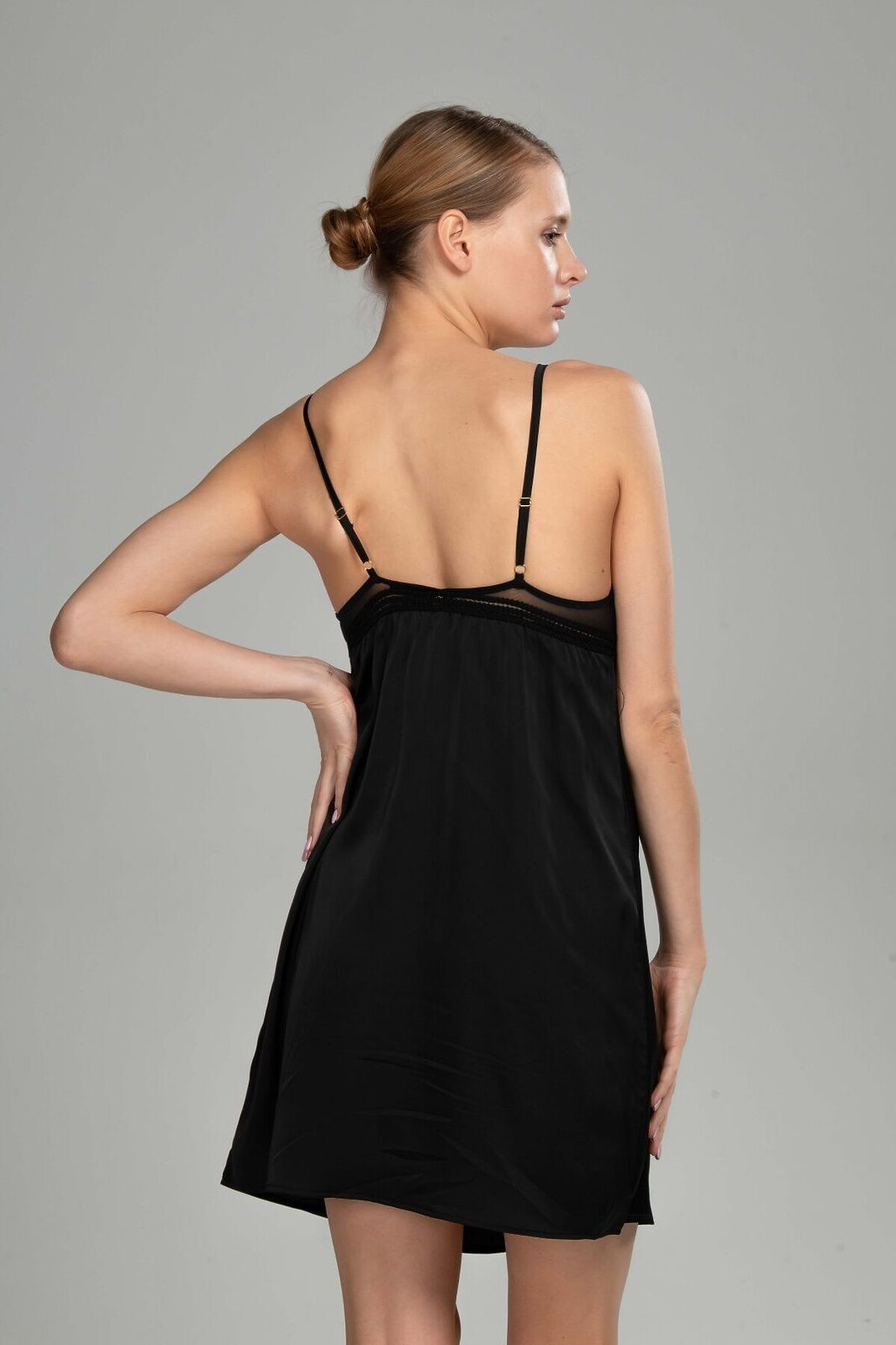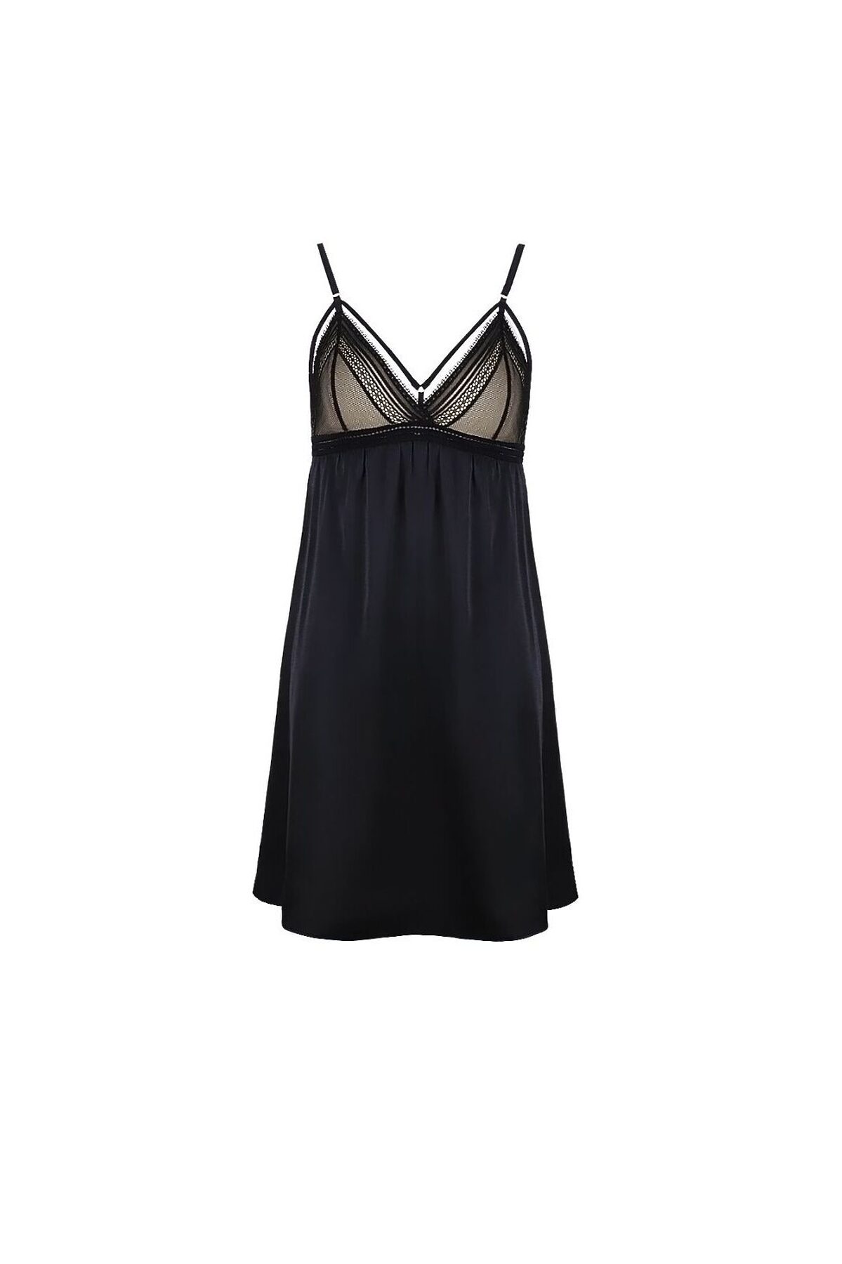 Домашняя сорочка от торговой марки Indefini. Сорочка черного цвета без косточек и без дополнительной поддержки груди, с поролоновыми подкладками. Со стрепами, с кружевными вставками и обрамлением, на тонких регулируемых бретелях. Приталенная, со свободным подолом.