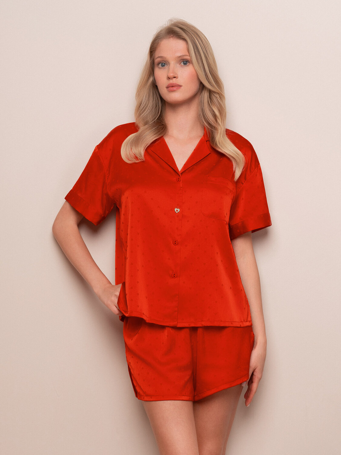Женская пижама из легкого и дышащего полиэстера пропускает воздух, что помогает ей оставаться комфортной и свежей во время сна. Верхняя часть в виде футболки с отложным воротником и пуговицами в тон ткани придает образу стильную завершенность. Одна пуговица в форме сердечка украшена драгоценными камнями. Шорты на мягкой резинке удобно облегают талию, создавая непринужденный и уютный комплект для сна и отдыха.