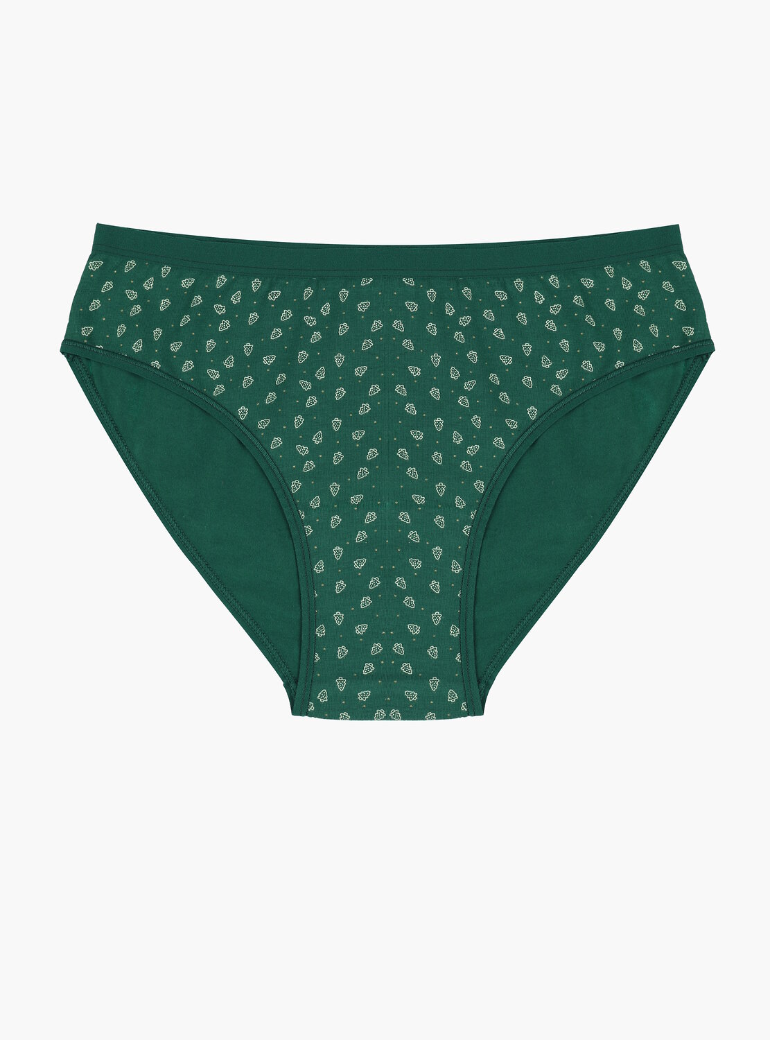 Трусы слипы женские, изготовленные из мягкого хлопка, приятно ощущаются на коже во время носки. Средняя посадка трусов гарантирует комфорт, мягкая эластичная резинка на талии надежно фиксирует трусы. Женские трусы слипы выполнены в зеленом цвете и украшены принтом с изображением елочек.