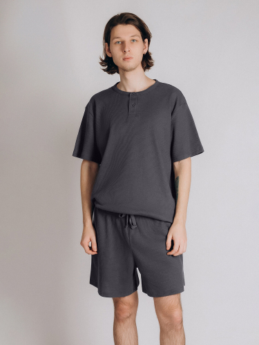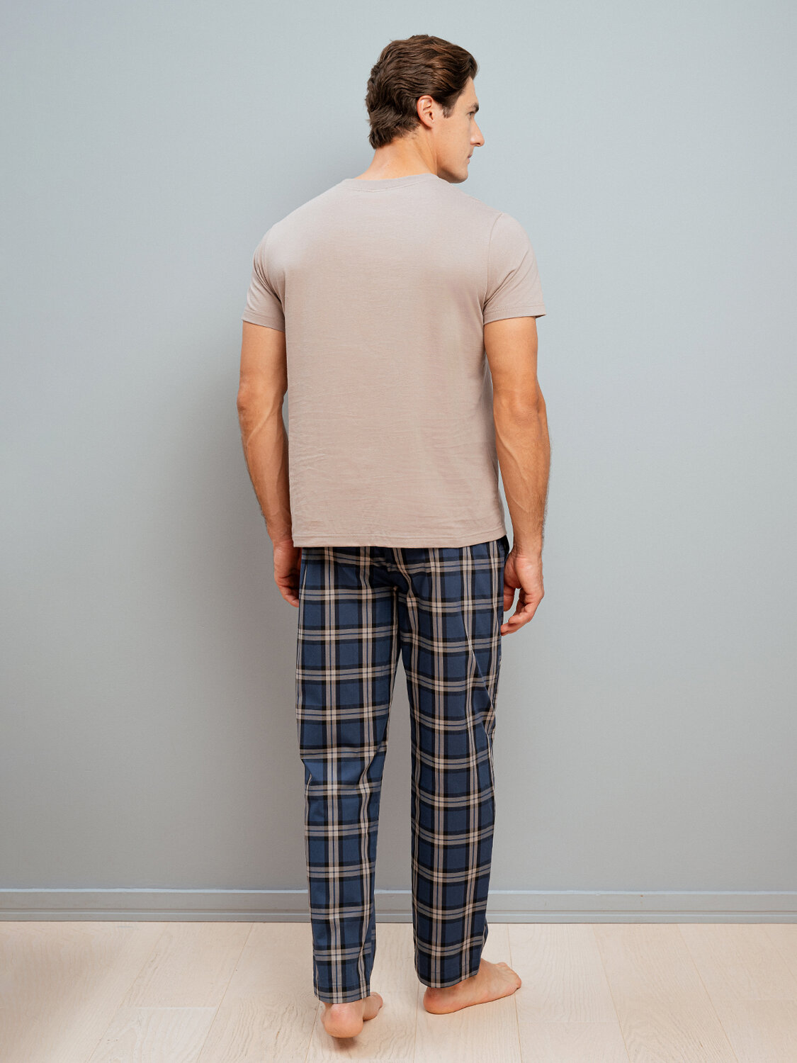 Мужская пижама, изготовленная из хлопка, состоит из футболки и брюк. Футболка свободного кроя с короткими рукавами и круглым вырезом. Брюки прямого кроя с мягкой эластичной резинкой и регулирующим поясом обеспечивают оптимальную посадку. Брюки украшены клетчатым принтом.