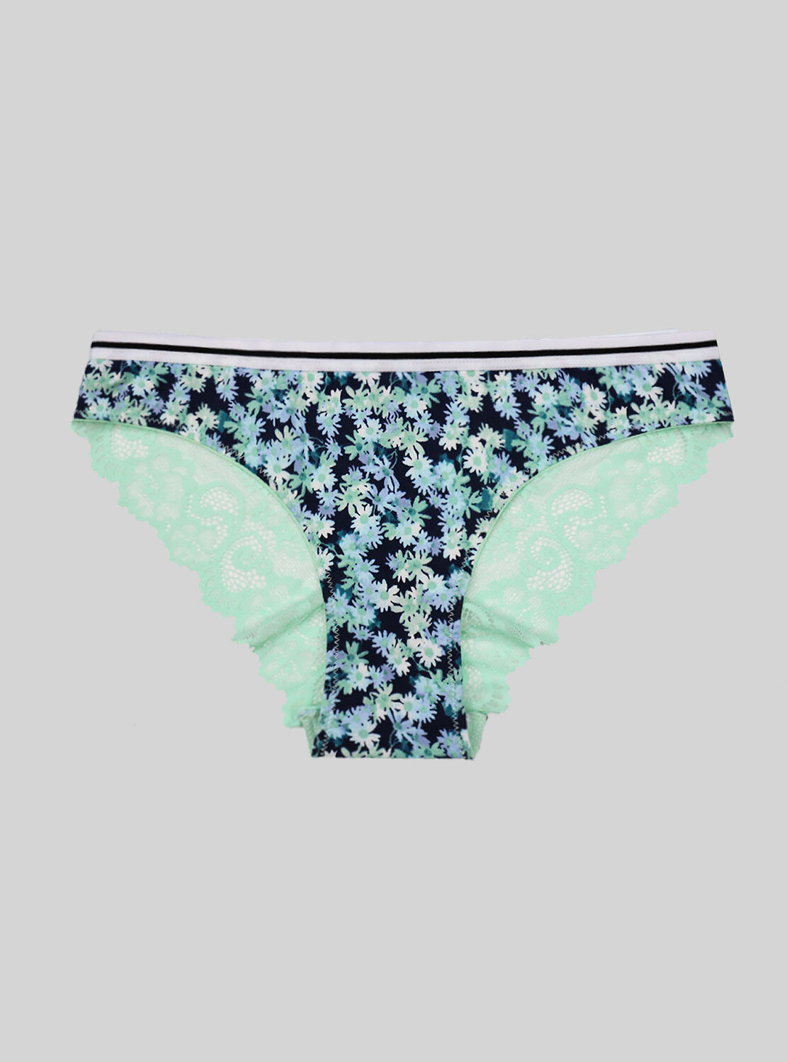 Женские трусы от торговой марки Индефини. Трусы-слипы из хлопка, черного цвета спереди, с цветочным принтом, с кружевной частью сзади зеленого цвета, средней посадки, на мягкой резинке.