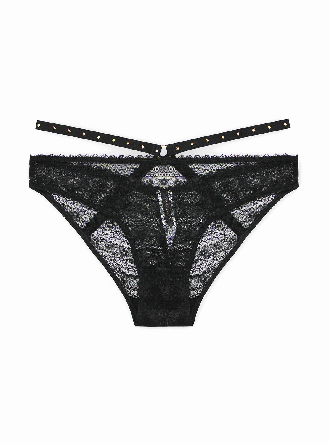 Женские трусы от торговой марки Индефини. Трусы-слипы из кружевной ткани черного цвета, дополнены декоративной портупеей, средней посадки, на мягкой резинке.