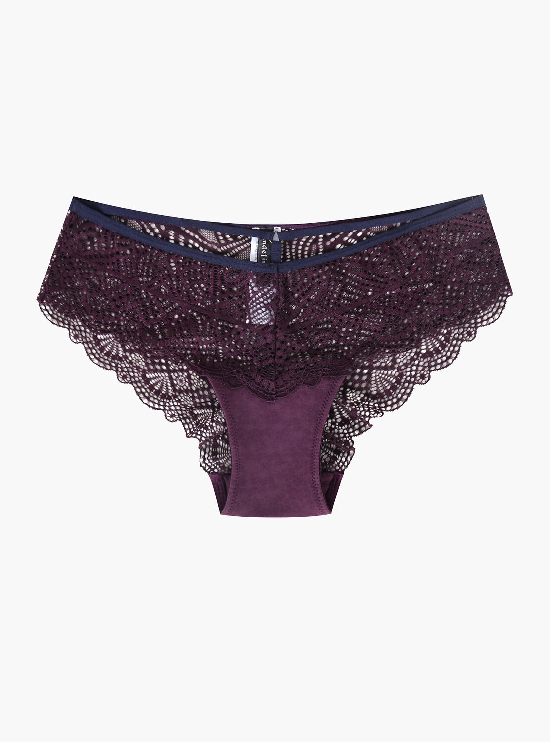 Женские трусы-слипы (Арт.141000-1045LUS) от торговой марки Индефини. Трусы-слипы кружевные фиолетового цвета из хлопка, на мягкой резинке, средней посадки.