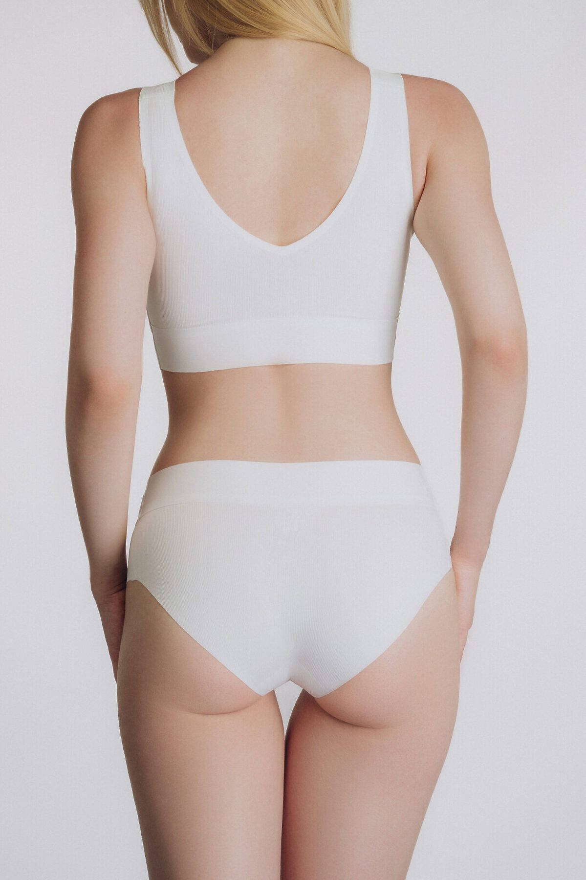 Бюстгальтер изготовлен из полиамида, выполнен в классическом белом цвете с фактурой ткани в рубчик. Бюстгальтер не имеет жестких деталей, поэтому отличается повышенным комфортом, при этом надежно фиксирует грудь. Чашки поролоновые, бретели широкие. Широкая резинка фиксирует бюстгальтер во время носки. Предлагаем в набор трусы слипы арт.5037WUV из наличия на сайте.