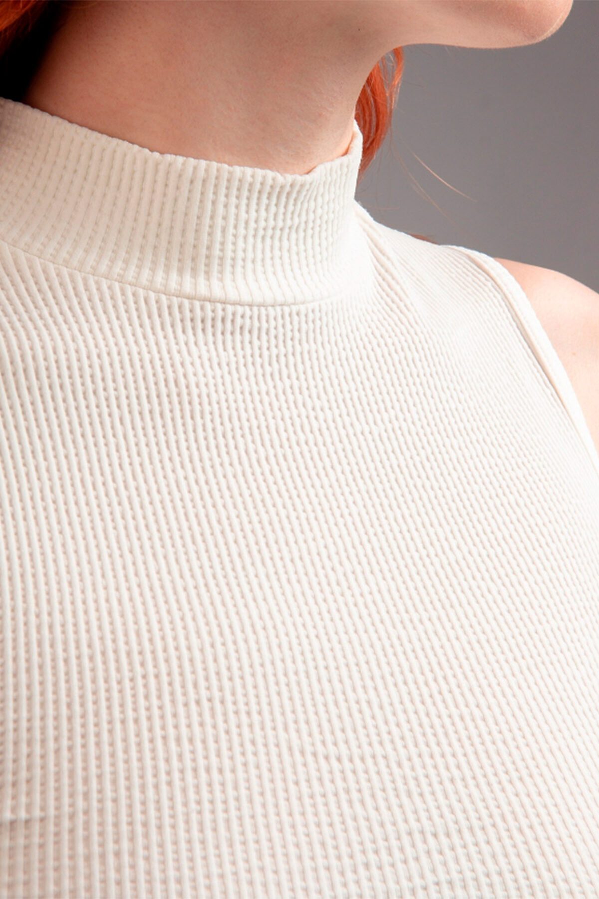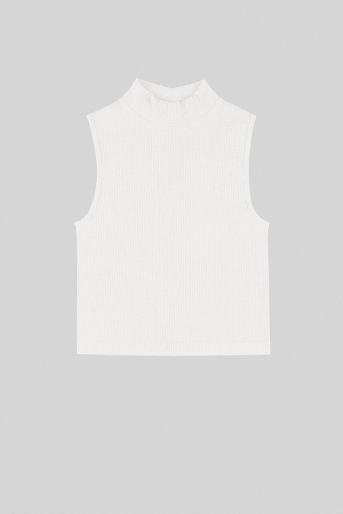 Женская майка-топ от торговой марки Индефини. Майка-топ из полиамида, белого цвета, в рубчик, с высоким горлом, без рукавов, укороченная, облегающая, на мягкой резинке.