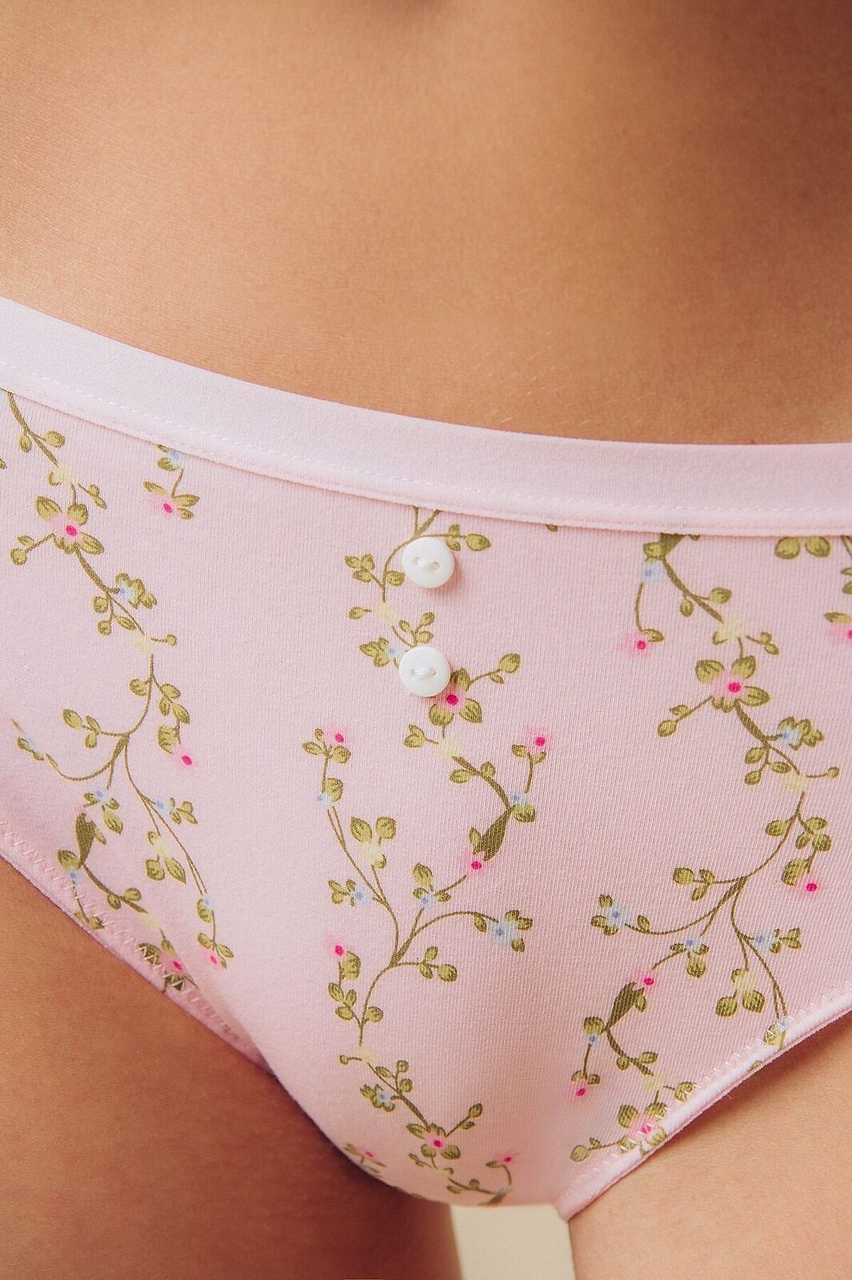 Трусы слипы женские 3346LUS бренда Indefini изготовлены из хлопкового материала. Выполнены в розовом цвете.На трусы нанесен цветочный принт. На талии мягкая эластичная резинка. По бокам имеются кружевные вставки. На передней части расположены две белые декоративные пуговицы.