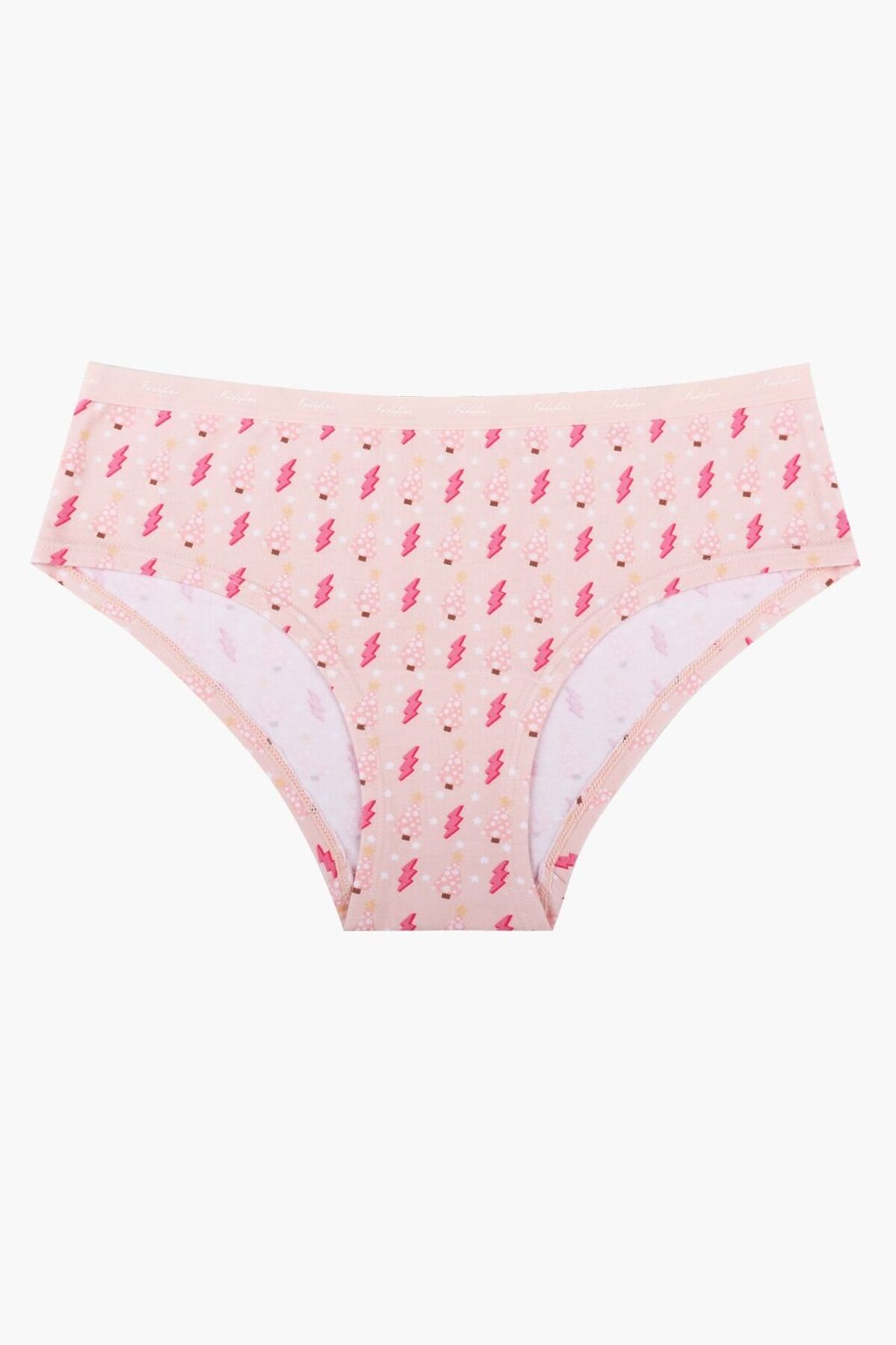 Трусы танга женские созданы из хлопка. Трусы средней посадки с мягкой резинкой на талии отлично сидят по фигуре, подчеркивая ее линии. Трусы танга женские украшены принтом с изображением елочек и молний.