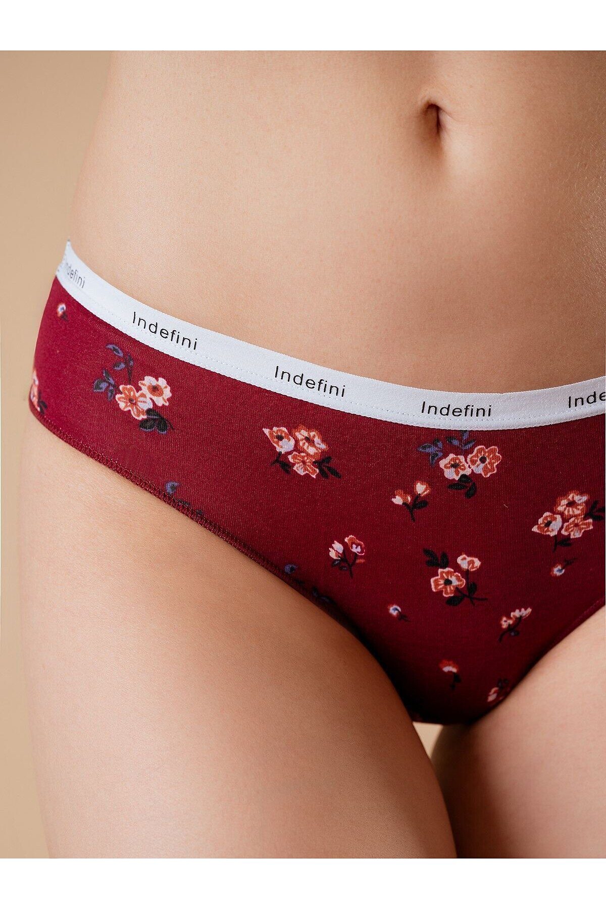 Женские трусы от торговой марки Индефини. Трусы-слипы из хлопка, бордового цвета, с цветочным принтом, с кружевной задней частью, на мягкой резинке, средней посадки.