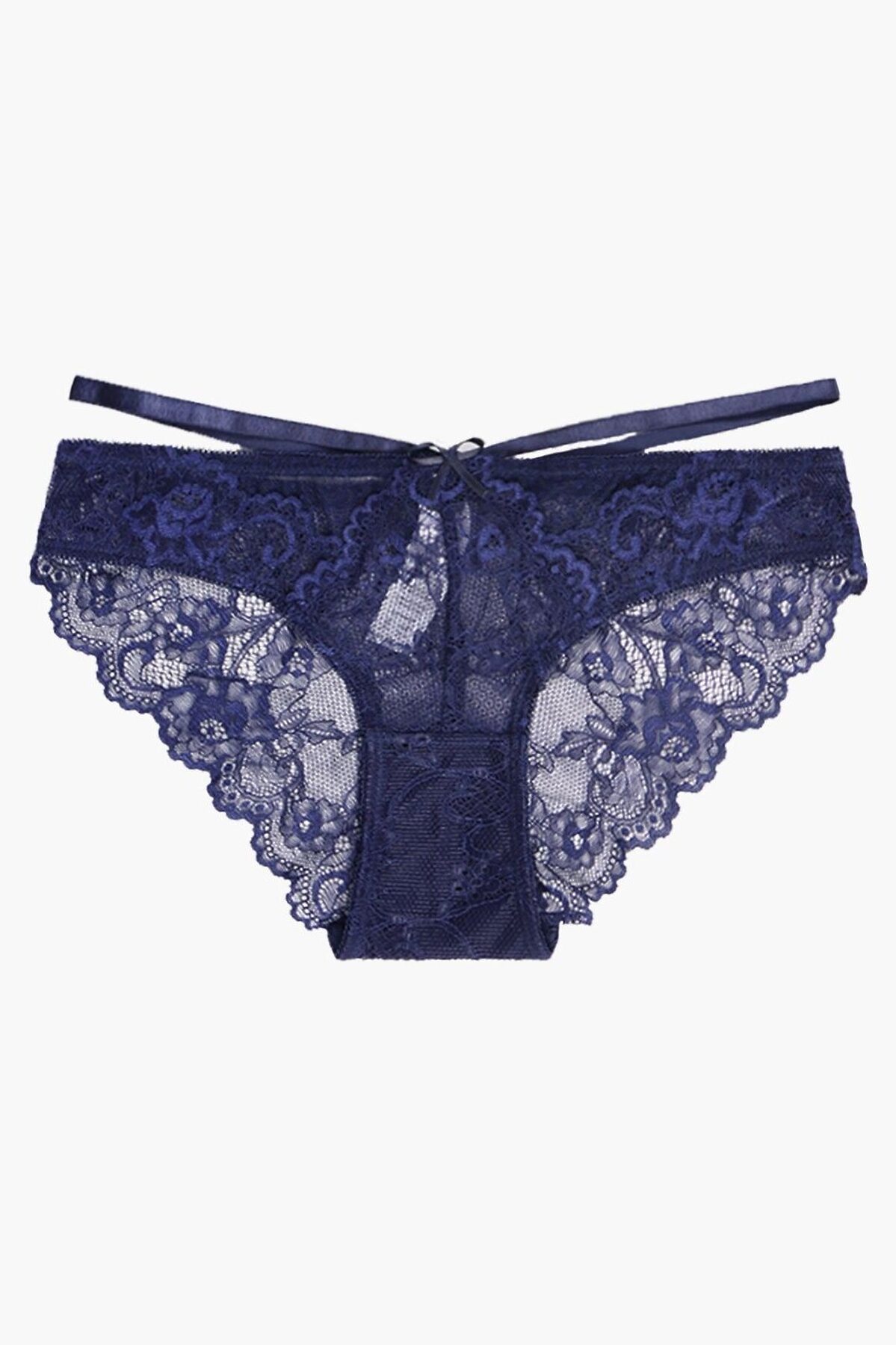 Трусы-слипы из кружевной ткани, синего цвета, с обрамлением, со стрепами, на мягкой резинке, средней посадки.