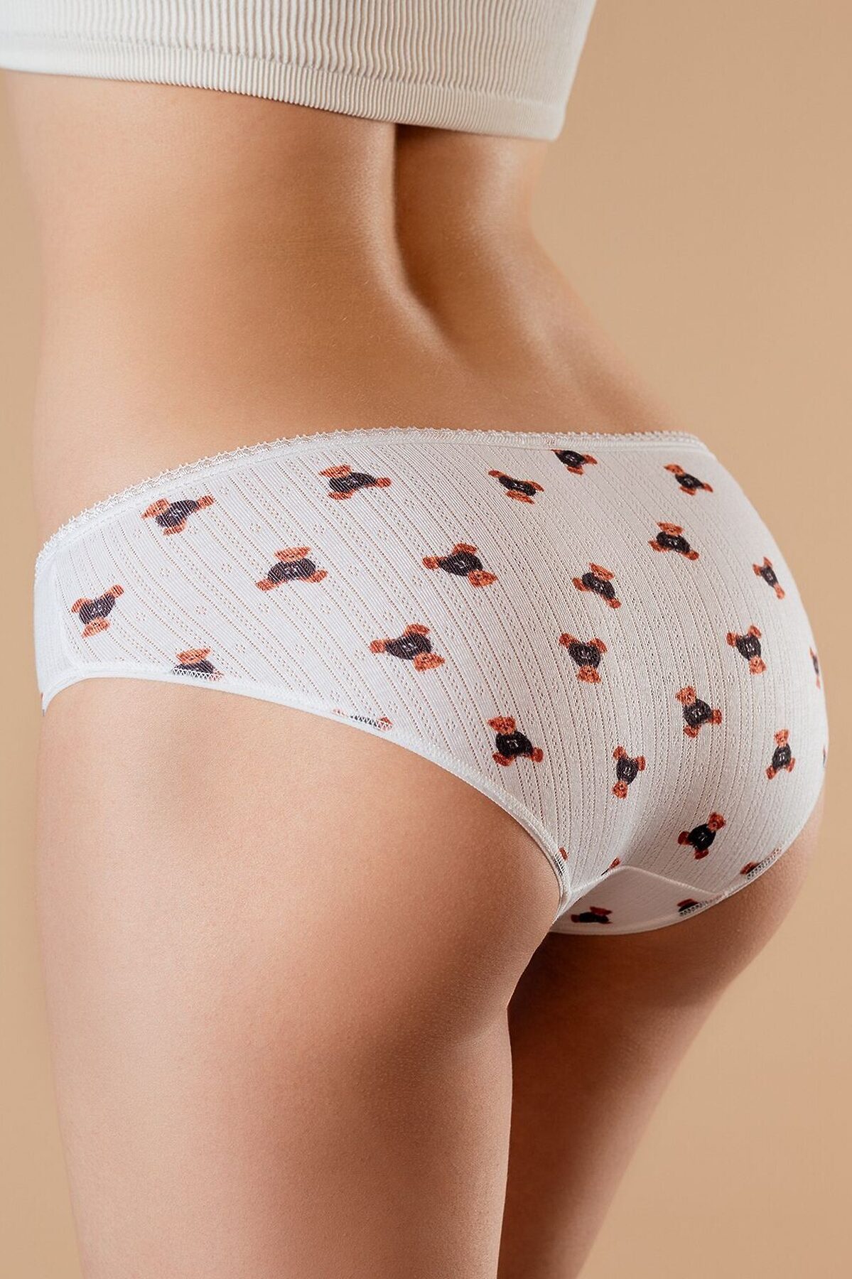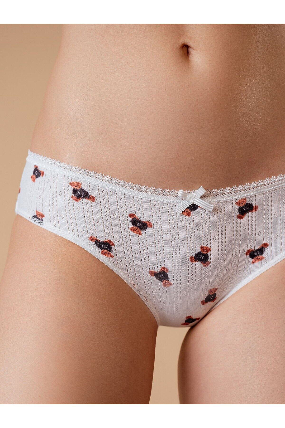 Трусы слипы женские 5022LUF бренда Indefini изготовлены из полиэстера. Ткань выполнена с отверстиями. Трусы выполнены в классическом белом цвете. На внутренней стороне трусов расположена хлопковая ластовица. Трусы имеют среднюю посадку. Тонкая эластичная резинка на талии украшена спереди белым декоративным бантиком. Трусы слипы украшены принтом с изображением плюшевых мишек.