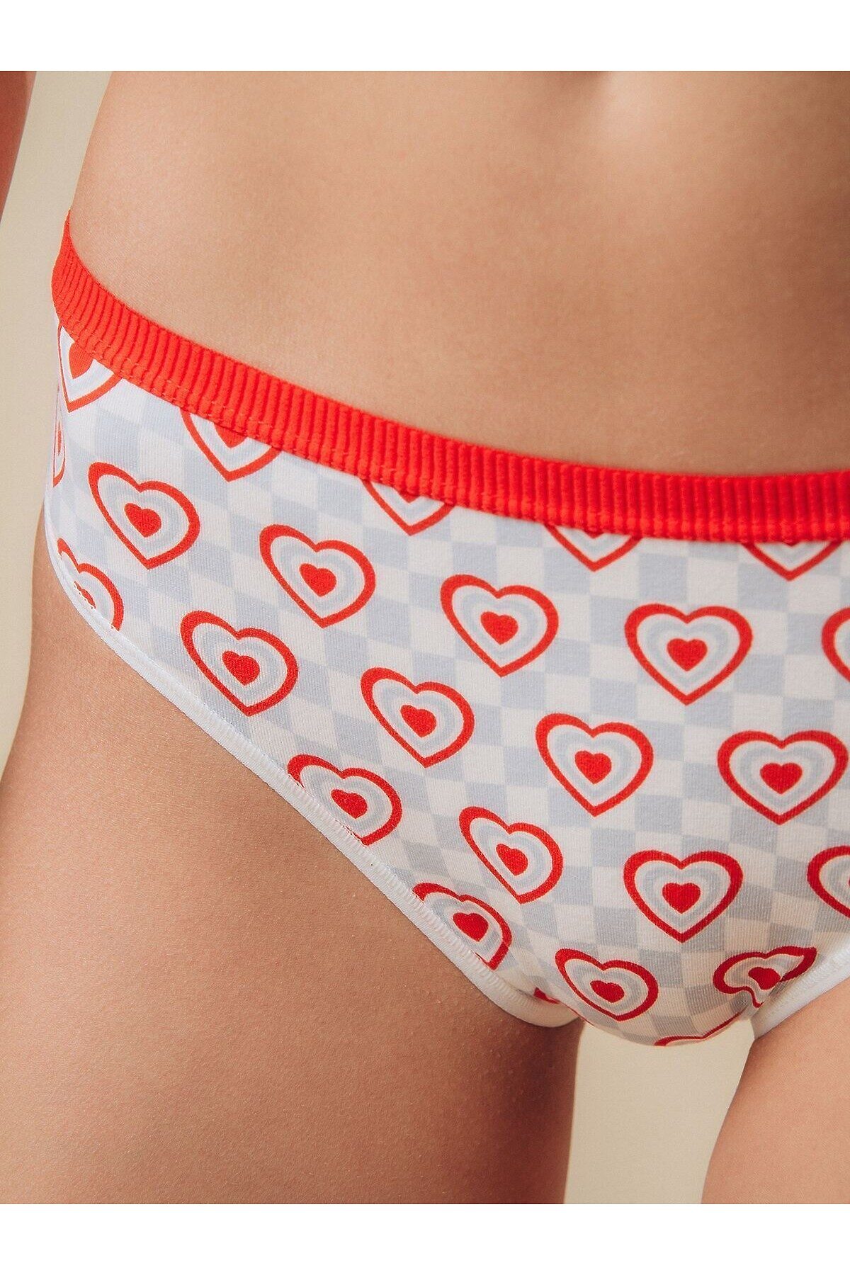 Трусы слипы женские изготовлены из хлопка. Трусы средней посадки имеют красную эластичную резинку на талии. Внутренняя сторона трусов дополнена хлопковой ластовицей. На трусы нанесён принт в бело-голубую клетку с изображением сердечек.