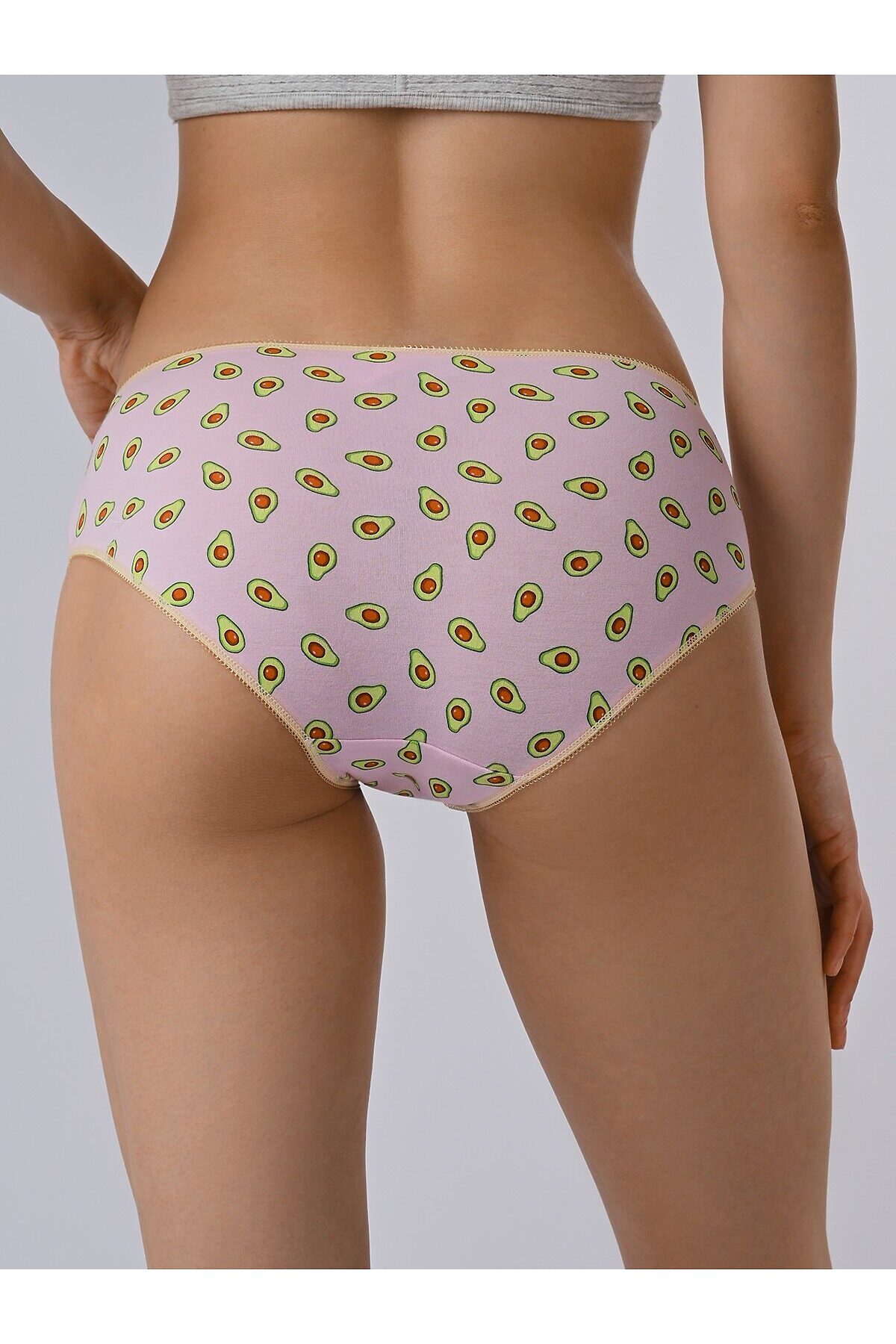 Трусы слипы женские изготовлены из хлопка. Они выполнены в розовом цвете с нанесенным фруктовым принтом с изображением авокадо. Трусы имеют среднюю посадку и мягкую тонкую желтую резинку на талии. На передней части имеется желтый декоративный бантик. На внутренней стороне трусов расположена хлопковая ластовица.