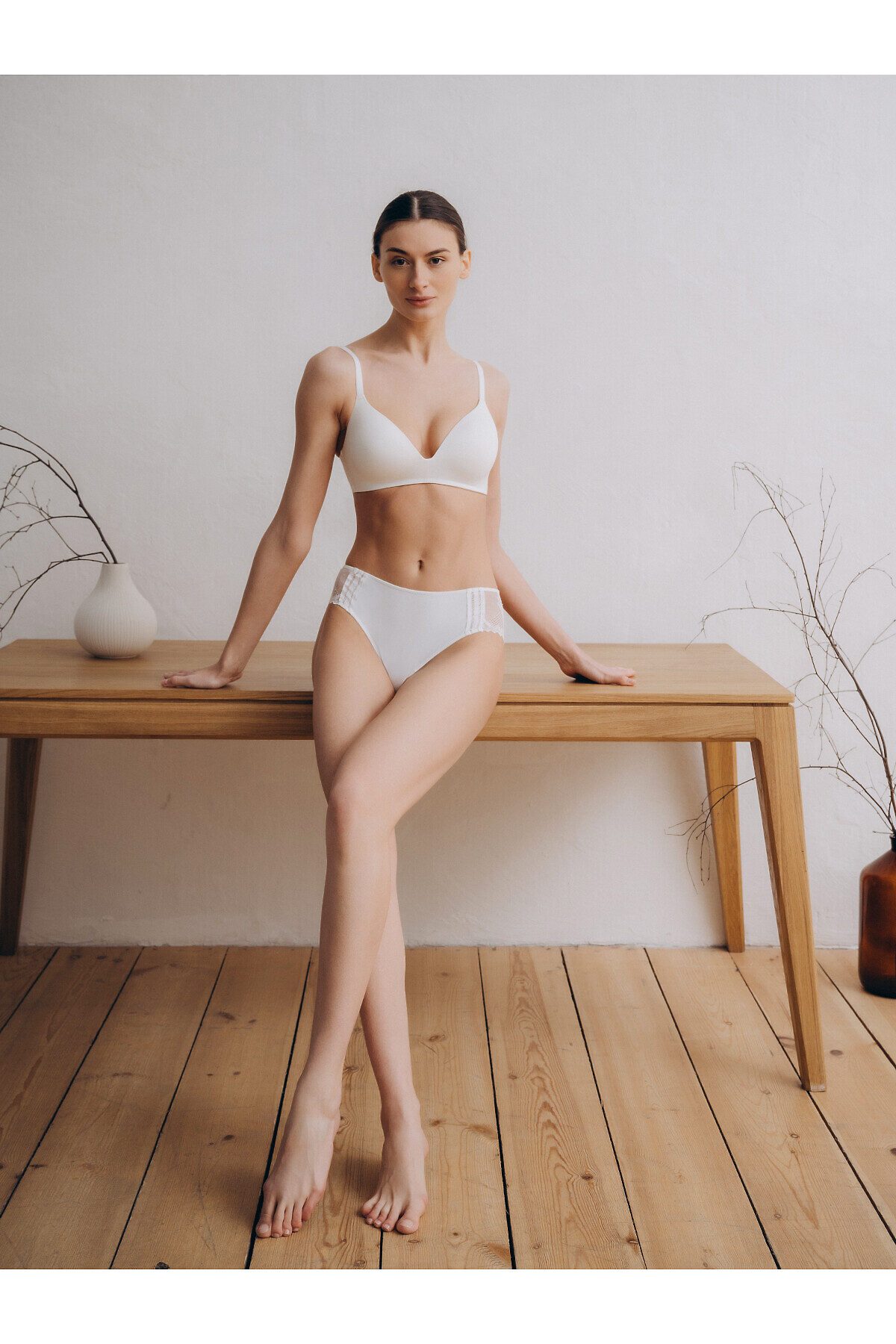 Трусы слипы женские изготовлены из полиамида и выполнены в классическом белом цвете. Задняя и боковая части трусов выполнены в кружевной ткани. Трусы слипы имеют среднюю посадку и тонкую мягкую резинку на талии. На внутренней стороне трусов расположена хлопковая ластовица.