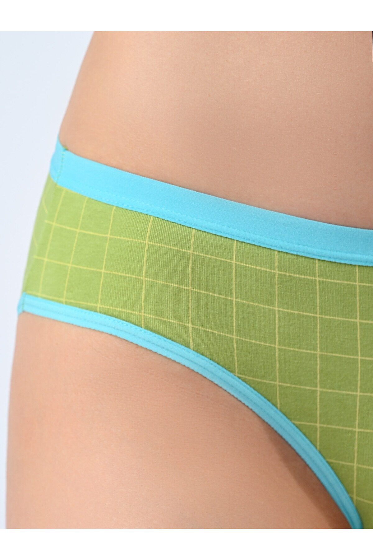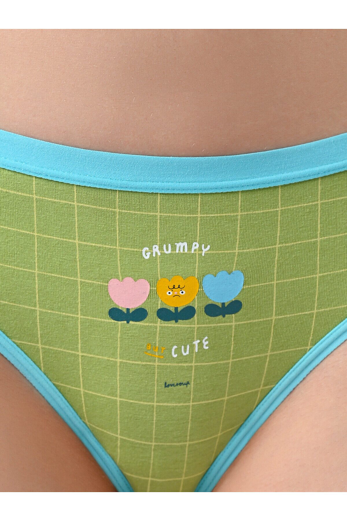 Трусы слипы женские изготовлены из хлопка, выполнены в зеленом цвете. Трусы средней посадки держатся на талии мягкой резинкой. На внутренней стороне трусов имеется хлопковая ластовица. На трусы нанесён принт в клетку с изображением цветочков и надписи.