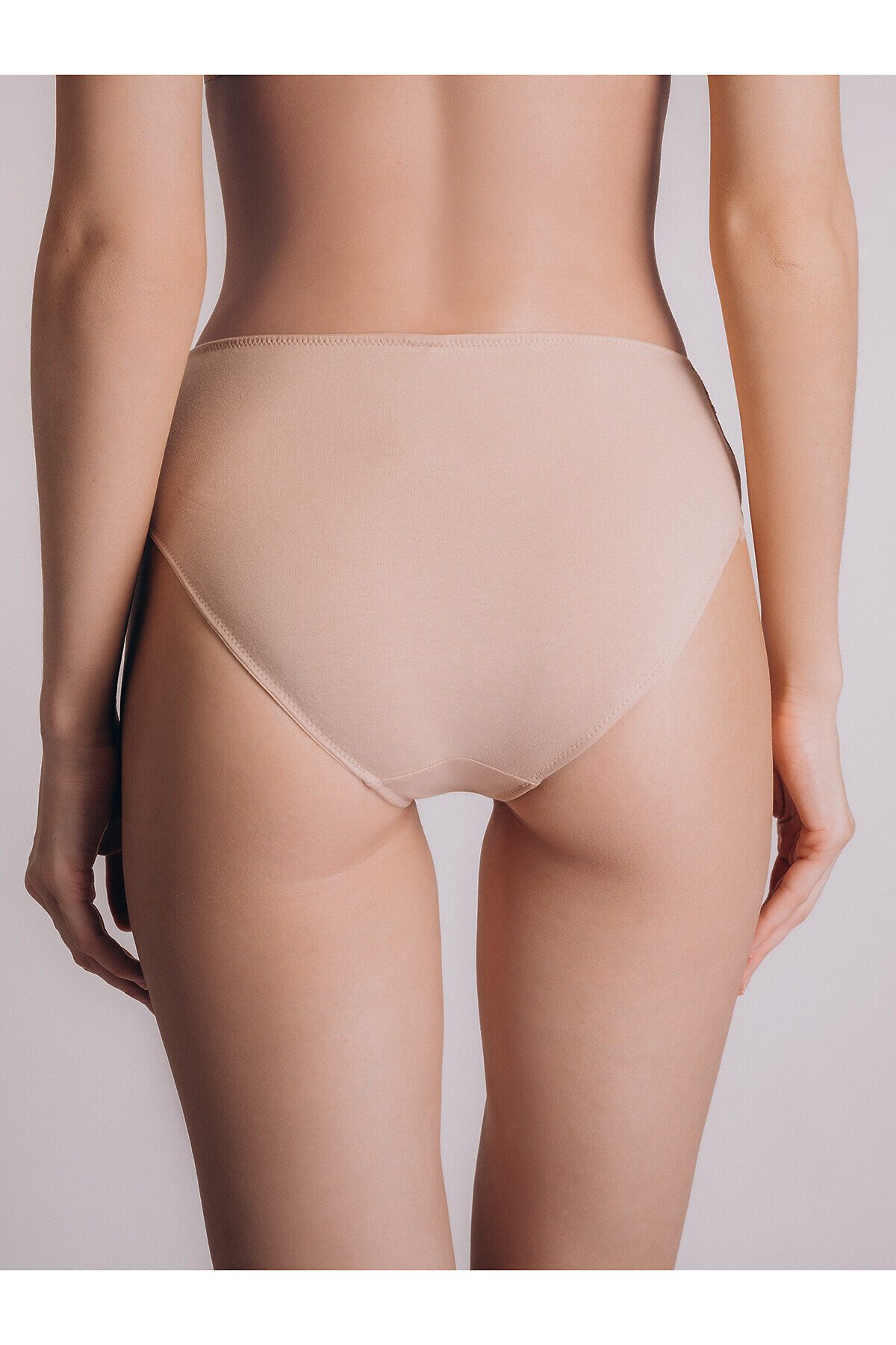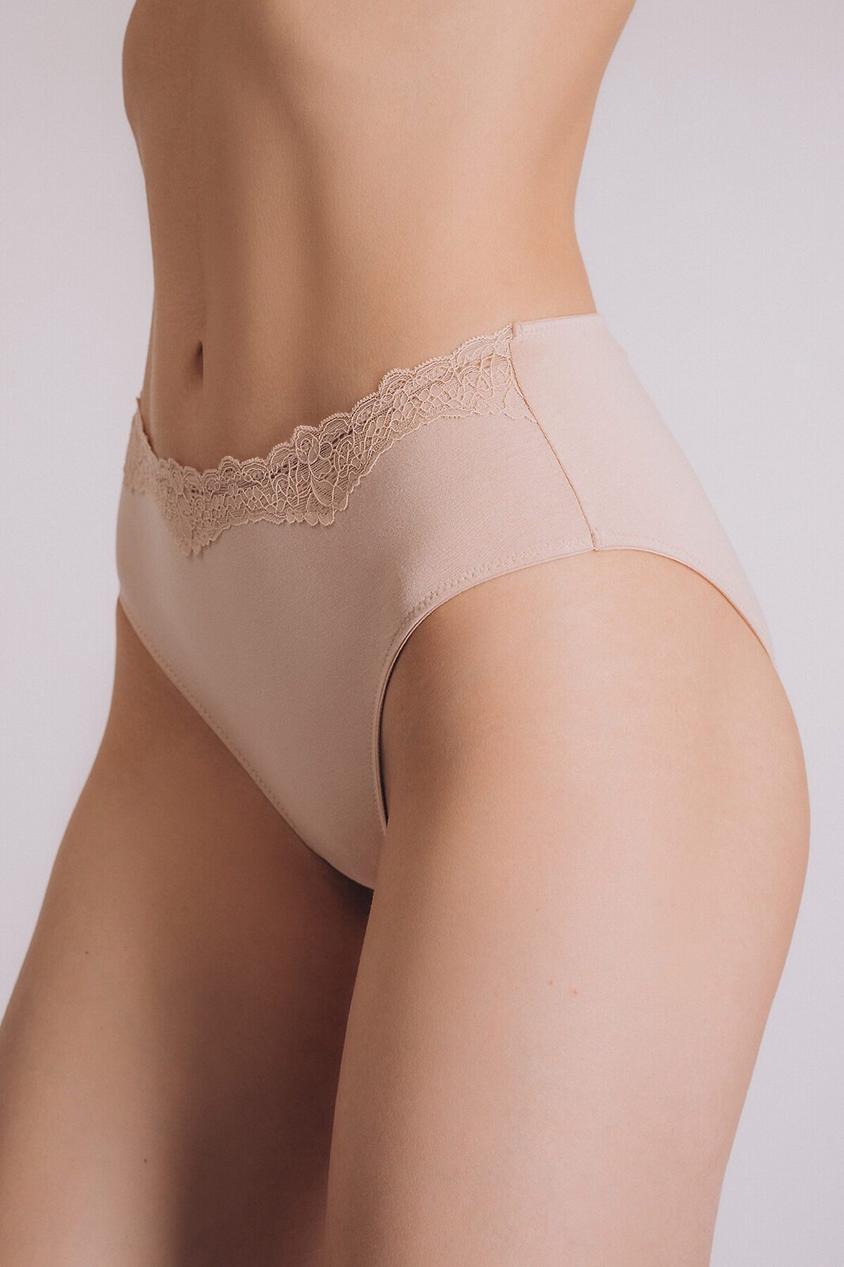 Трусы слипы женские изготовлены из хлопка, выполнены в бежевом цвете. Трусы имеют среднюю посадку и тонкую резинку на талии. На внутренней стороне трусов имеется хлопковая ластовица. Резинка обрамлена цветочным кружевом.