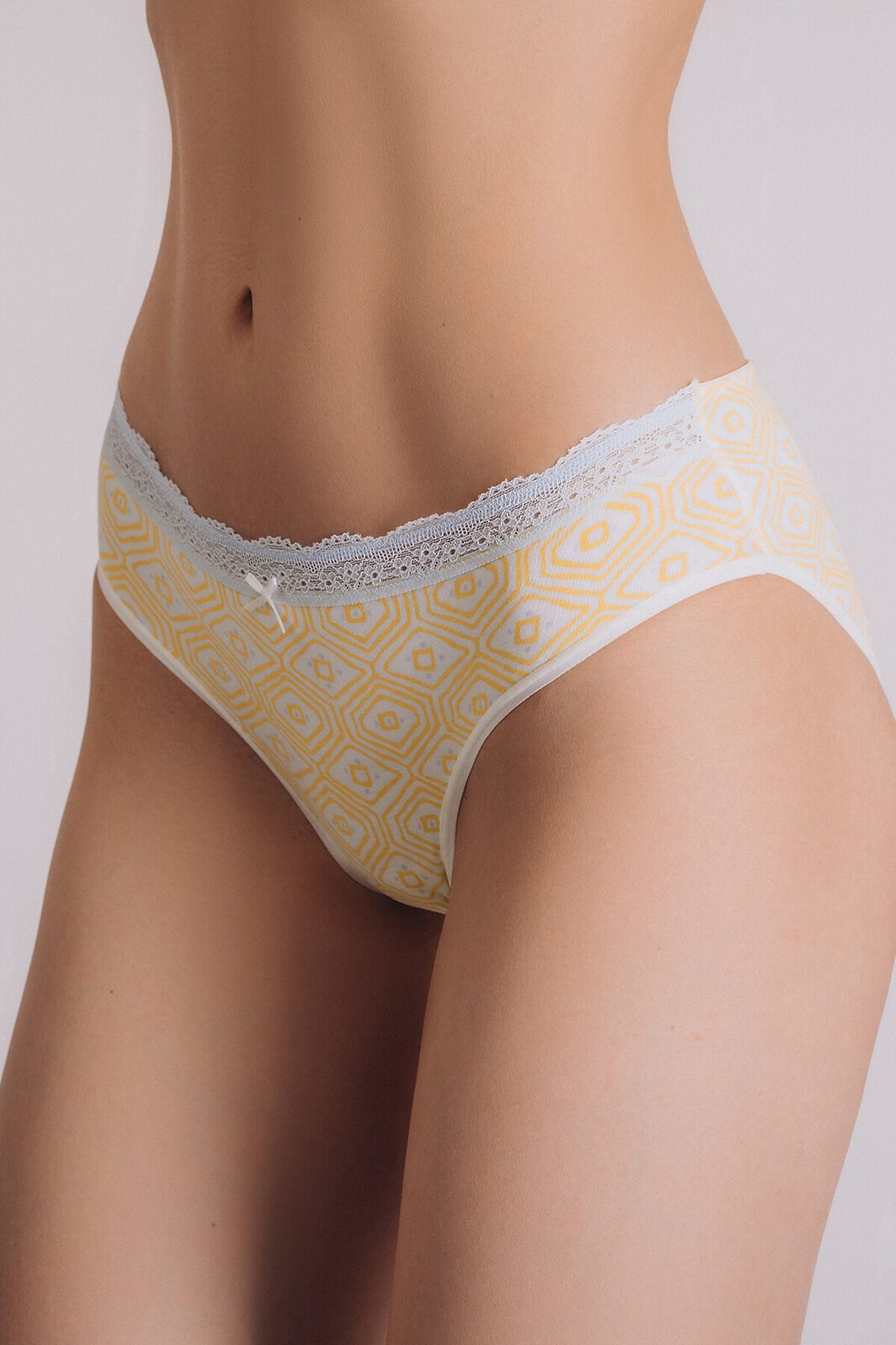 Мягкие трусы-слипы Indefini 3263LUF из хлопка C оригинальным желтым узором. Трусы средней посадки держатся на талии мягкой кружевной резинкой белого цвета.