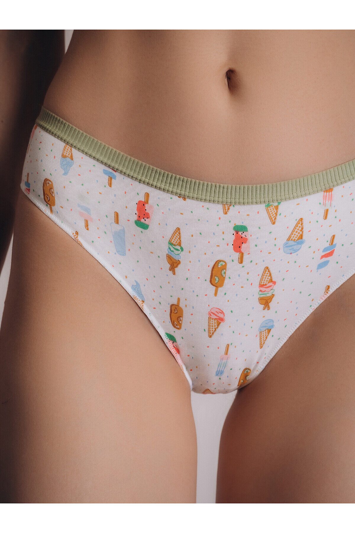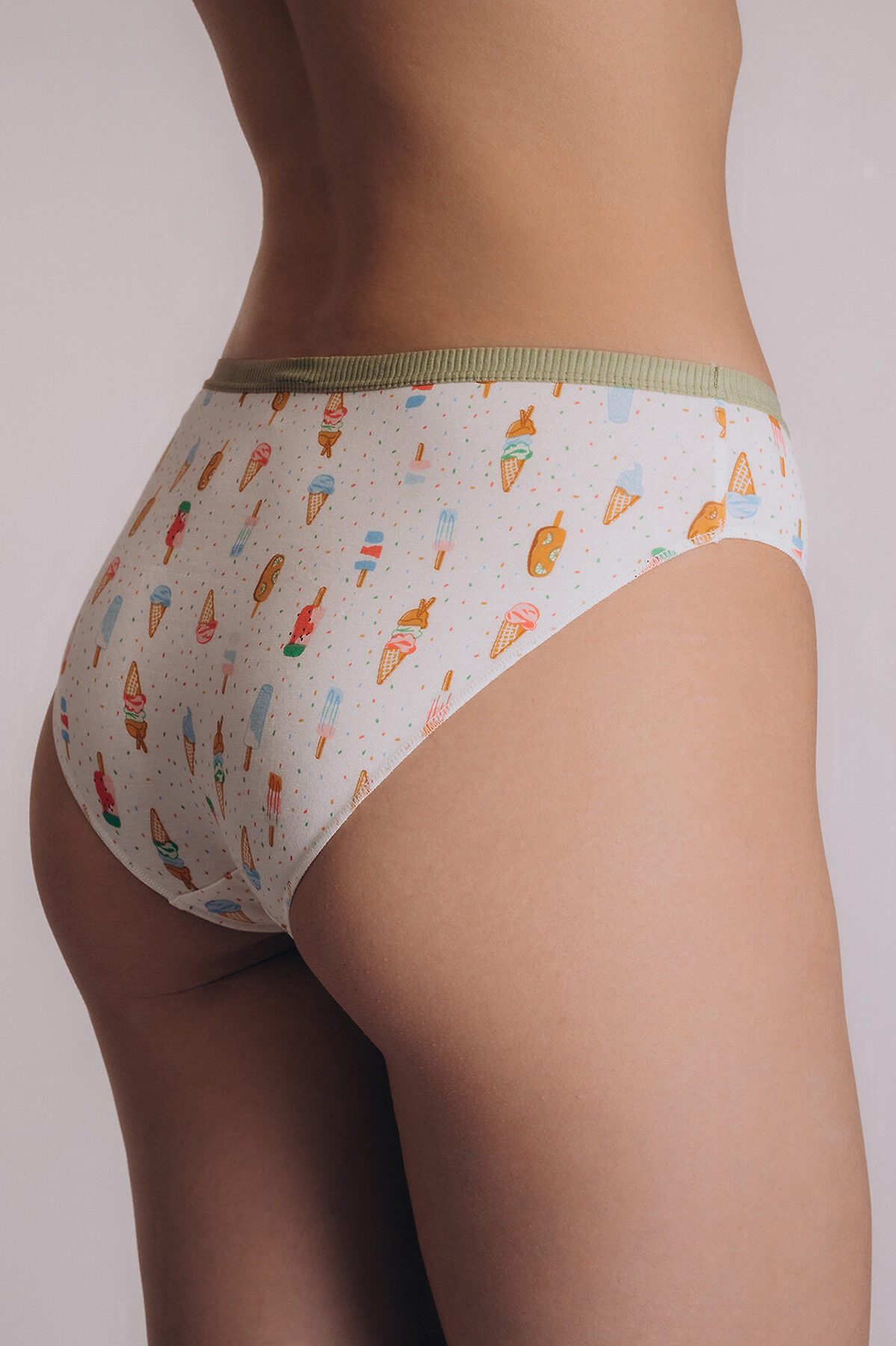 Женские трусы-слипы из мягкого хлопка с гигиенической ластовицей. Модель украшена ярким принтом с изображением мороженого. Особенности: Материал: 95% хлопок, 5% эластан, обеспечивающий комфорт и долговечность. Дизайн: Принт с мороженым и зелёная резинка на поясе. Комфорт: Мягкий пояс на резинке плотно фиксирует трусы на теле, а плоские швы обеспечивают удобство.