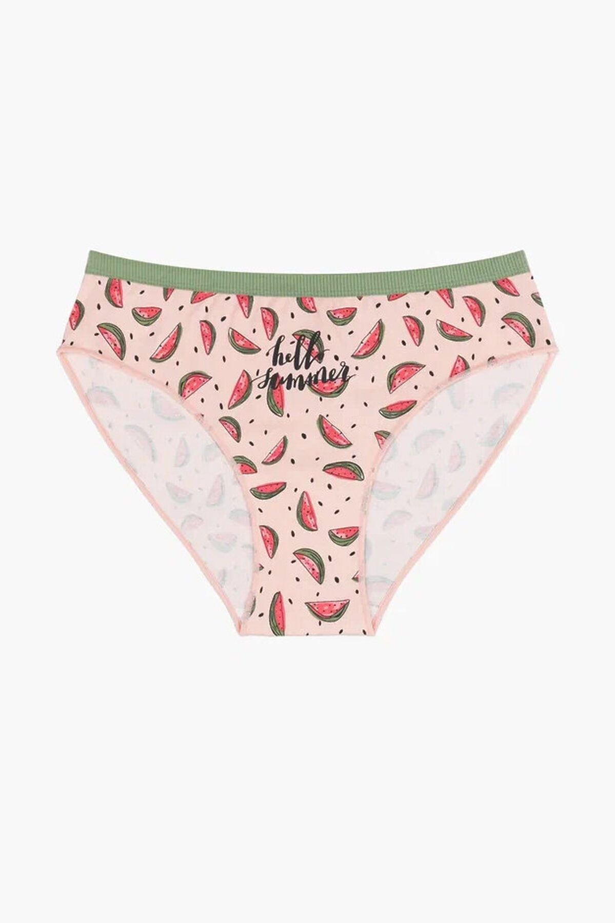 Женские трусы-слипы выполнены из мягкого хлопка, обеспечивающий комфорт и воздухопроницаемость. Модель украшена ярким принтом с арбузами и надписью «hell summer» Особенности: - Материал: 95% хлопок, 5% эластан, что обеспечивает мягкость и эластичность. - Дизайн: Принт с арбузами и зелёная резинка на поясе. - Комфорт: Мягкий пояс на резинке плотно фиксирует трусы на теле, а плоские швы обеспечивают удобство.