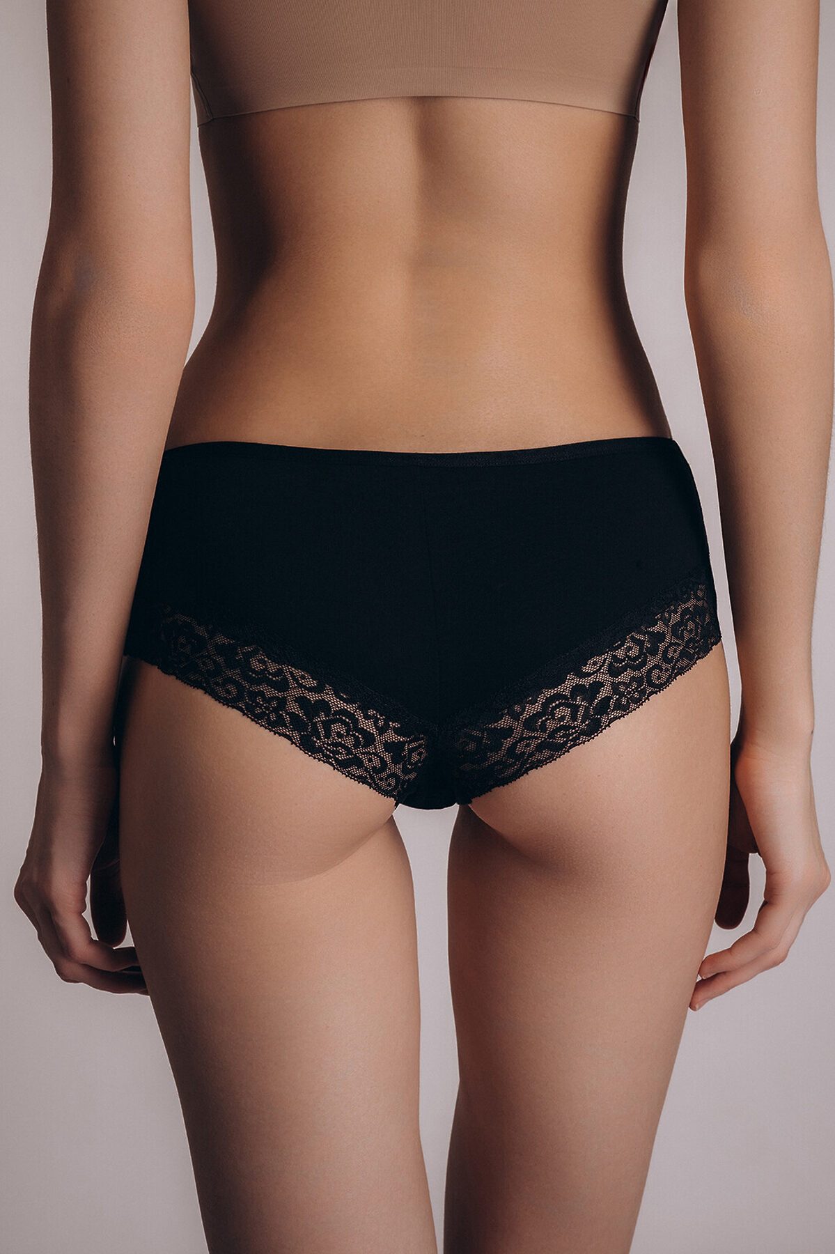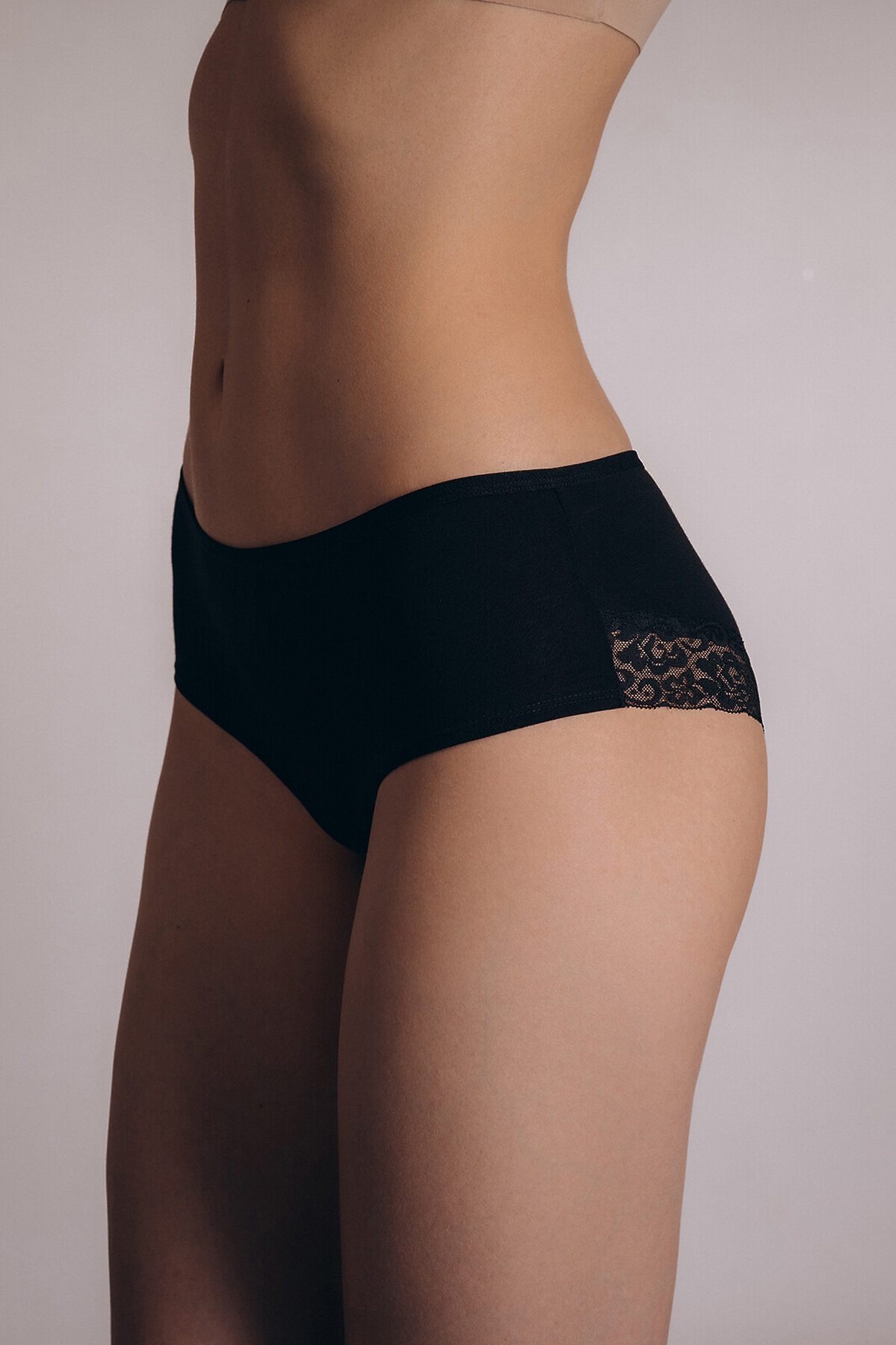 Чёрные трусы-слипы из натуральных материалов. Задняя часть украшена изящным кружевом, которое плавно перетекает на переднюю часть, создавая эффект рюшек в передней части.