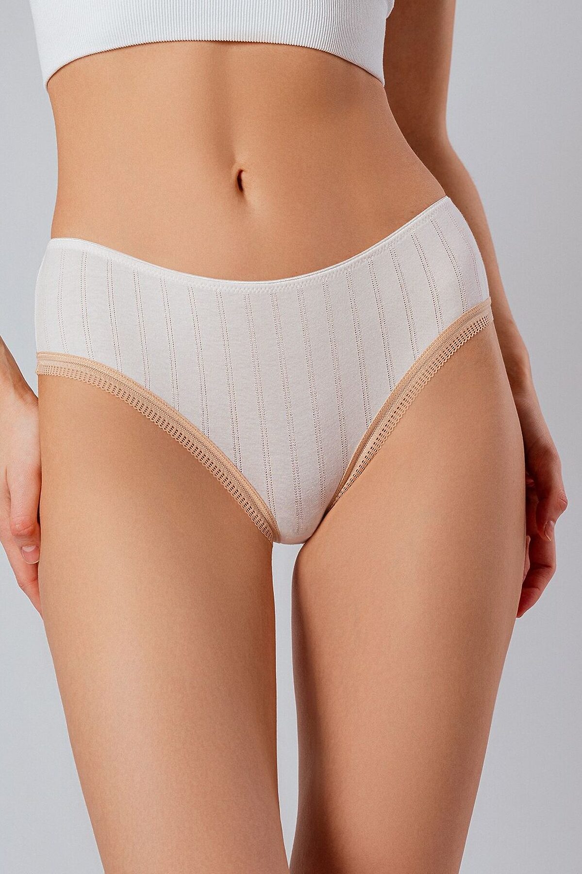 Набор 4078LUFZ бренда Indefini состоит из двух трусов танга женских. Трусы изготовлены из хлопкового материала. Трусы имеют среднюю посадку и мягкую резинку на талии, не оставляющая следов на коже. Ткань выполнена с маленькими отверстиями. Одни трусы выполнены в классическом белом цвете, вторые – в бежевом. Нижние вырезы обоих трусов обрамлены бежевым цветом.