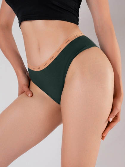 Трусы слипы из хлопка темно-зеленого оттенка — прекрасный вариант белья на каждый день Универсальный оттенок, средняя посадка — нижнее белье легко сочетается с повседневной одеждой, а небольшое количество эластана в составе делает белье долговечным и тянущимся.