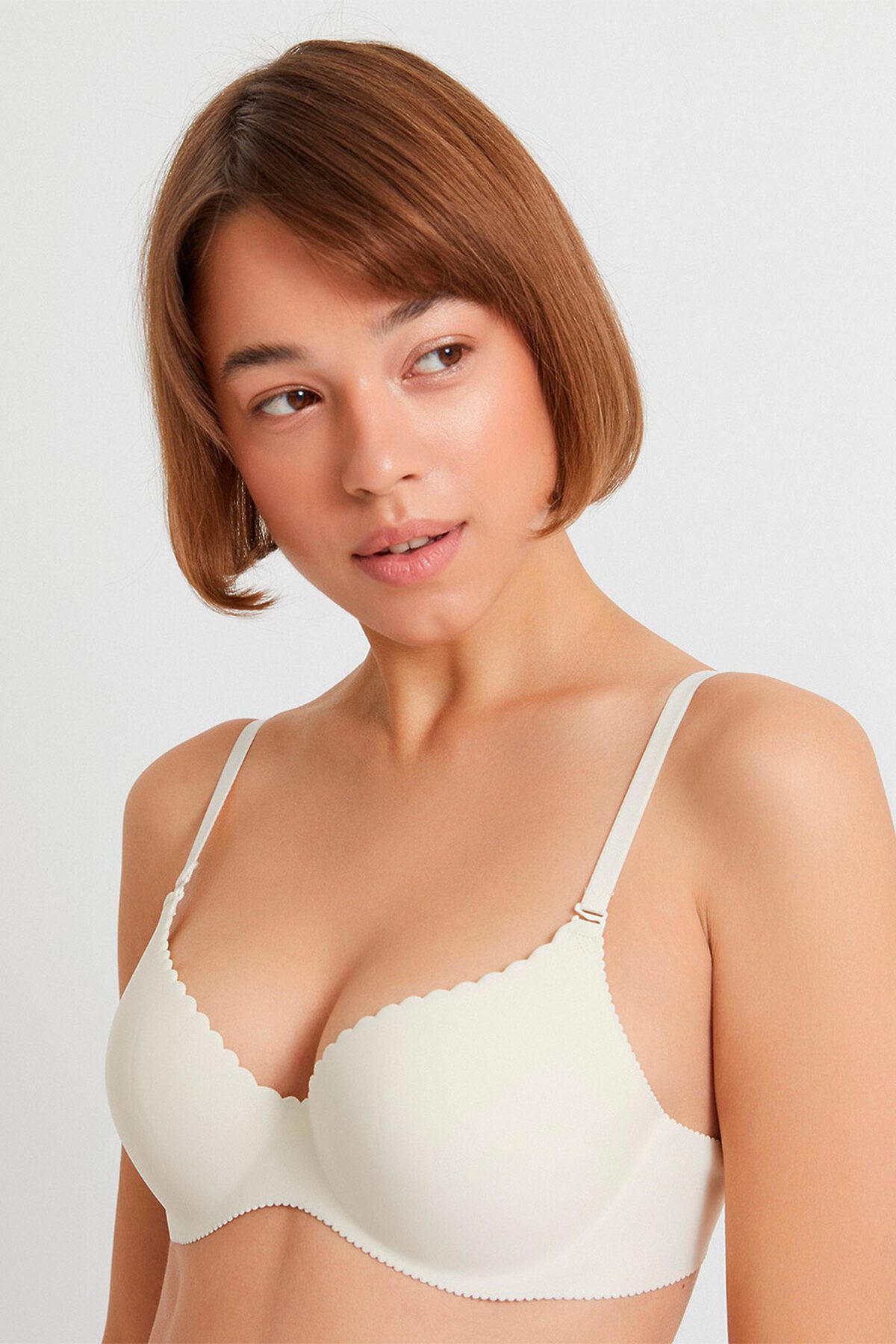 - Базовый бесшовный бюстгальтер T-Shirt с формованной чашкой с небольшим уплотнением по низу чашки, одинаковым для всех размеров. - Срезы бюстгальтера обработаны фигурными запаянными швами, что делает бюстгальтер более незаметным под одеждой. - Бретели регулируемые, съемные. Молочный