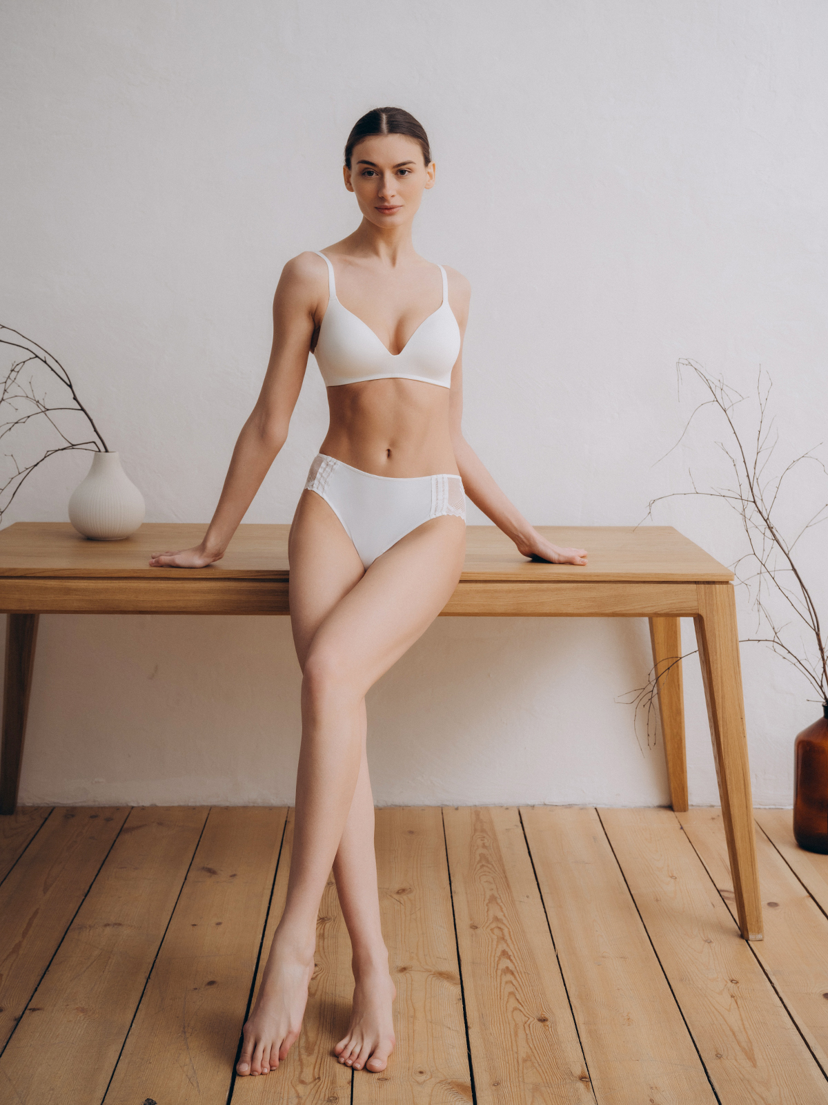 Базовый бюстгальтер изготовлен из полиамида, выполнен в классическом белом цвете.