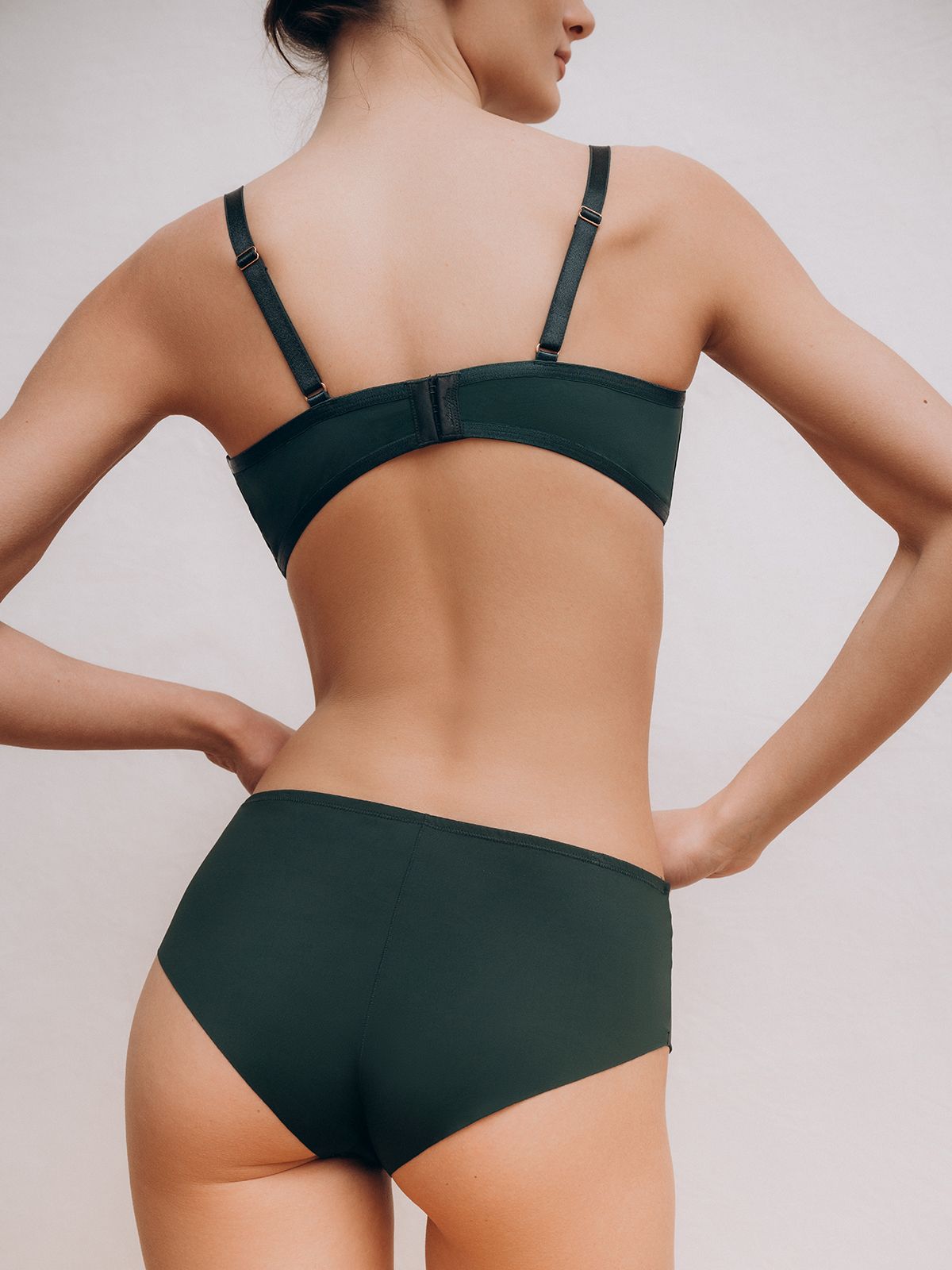 Женский комплект нижнего белья выполнен из кружевного материала. Бюстгальтер нежный, без пуш-апа. Хорошо поддерживает грудь и формирует естественную форму. Фигурный край чашек аккуратно подчеркивает линию декольте. Трусы красиво сидят по фигуре. Передняя часть слипов с полупрозрачной кружевной вставкой, а боковые и задняя части из гладкого эластичного материала.